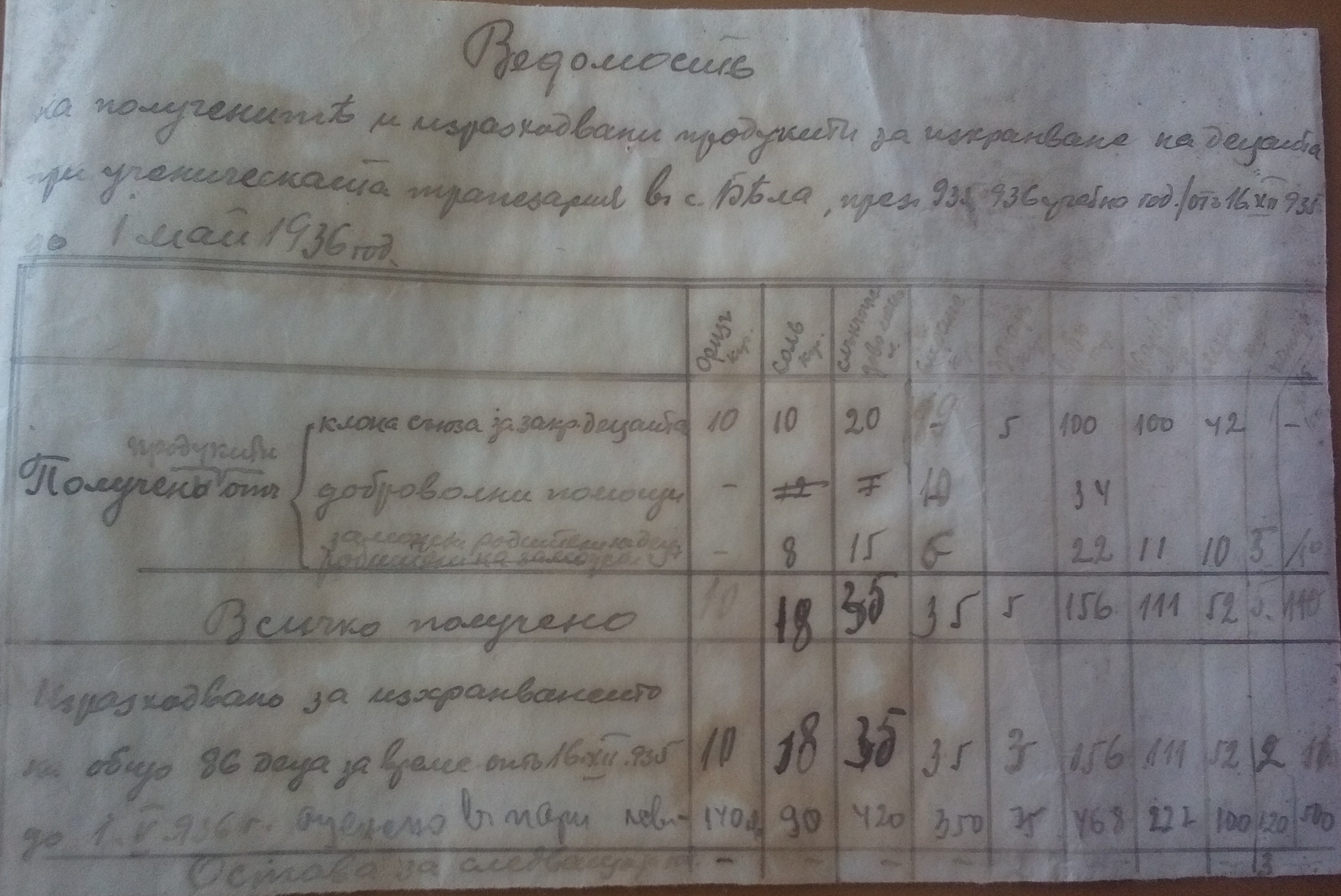 Ведомост за получените и изразходвани продукти за изхранване на децата при училищната трапезария село Бела, рез 1935; 1936 учебна година (от 12.16.1935 – 01.05.1936г.