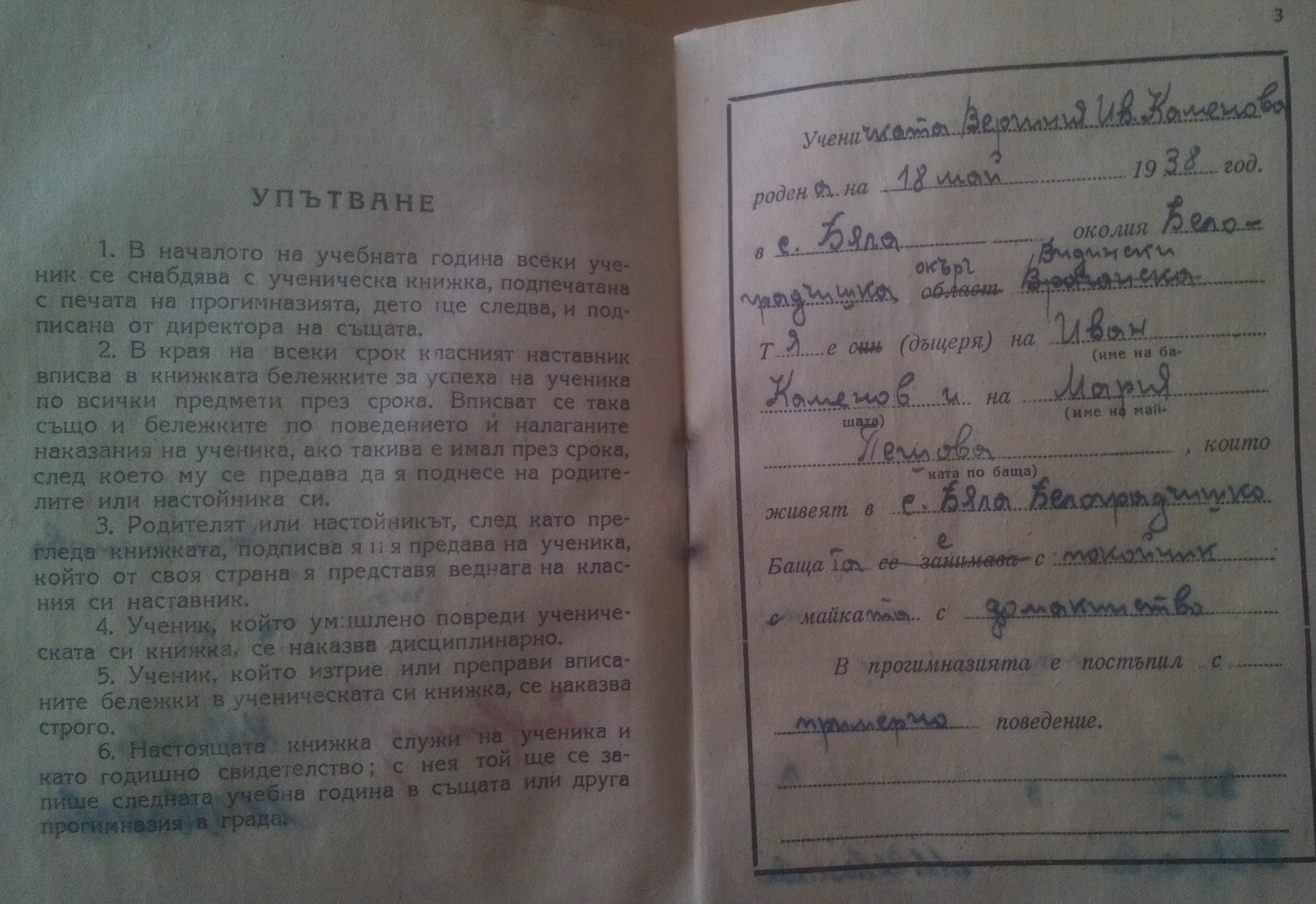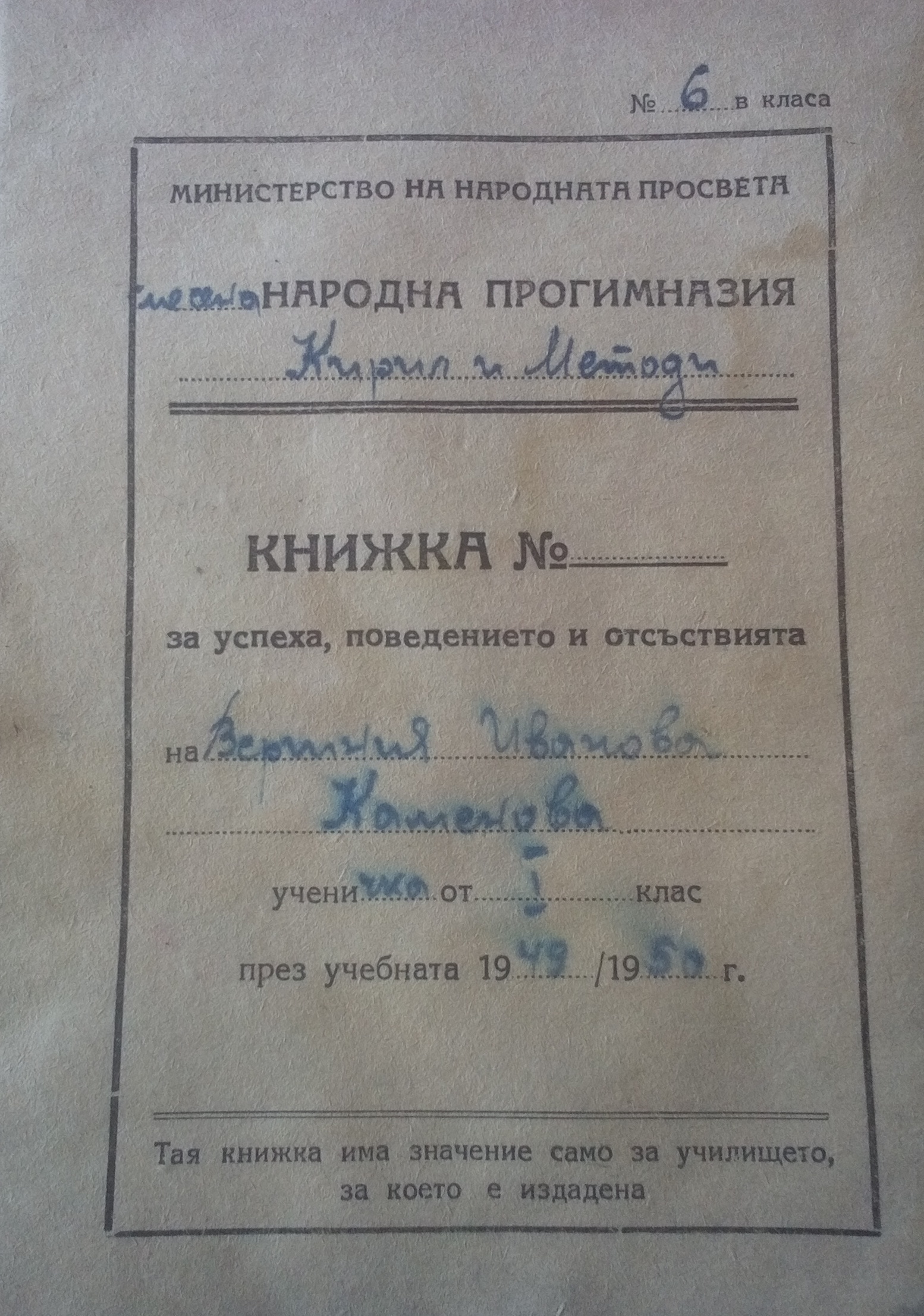 Книжка N 6 на Вергиния Иванова Каменова ученичка от 1-ви клас преез учебната 1949/50 година.