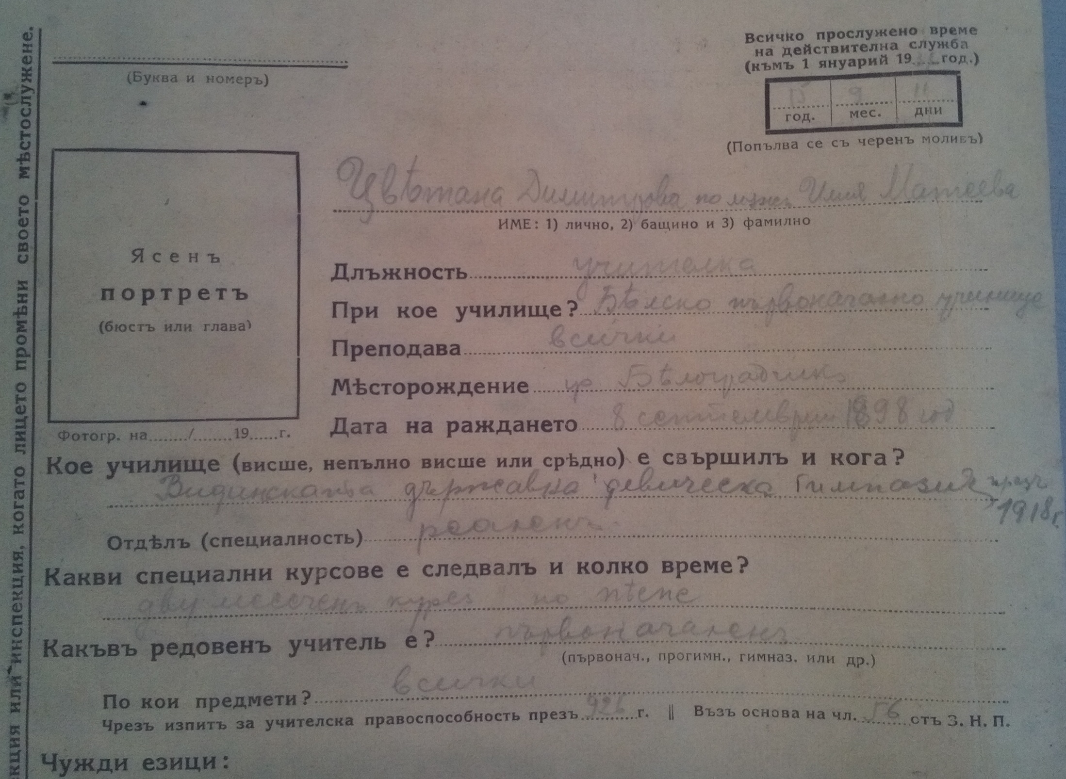 По кои предмети: Всички ; Чрез изпити за учителска правоспособност през 1926 година.