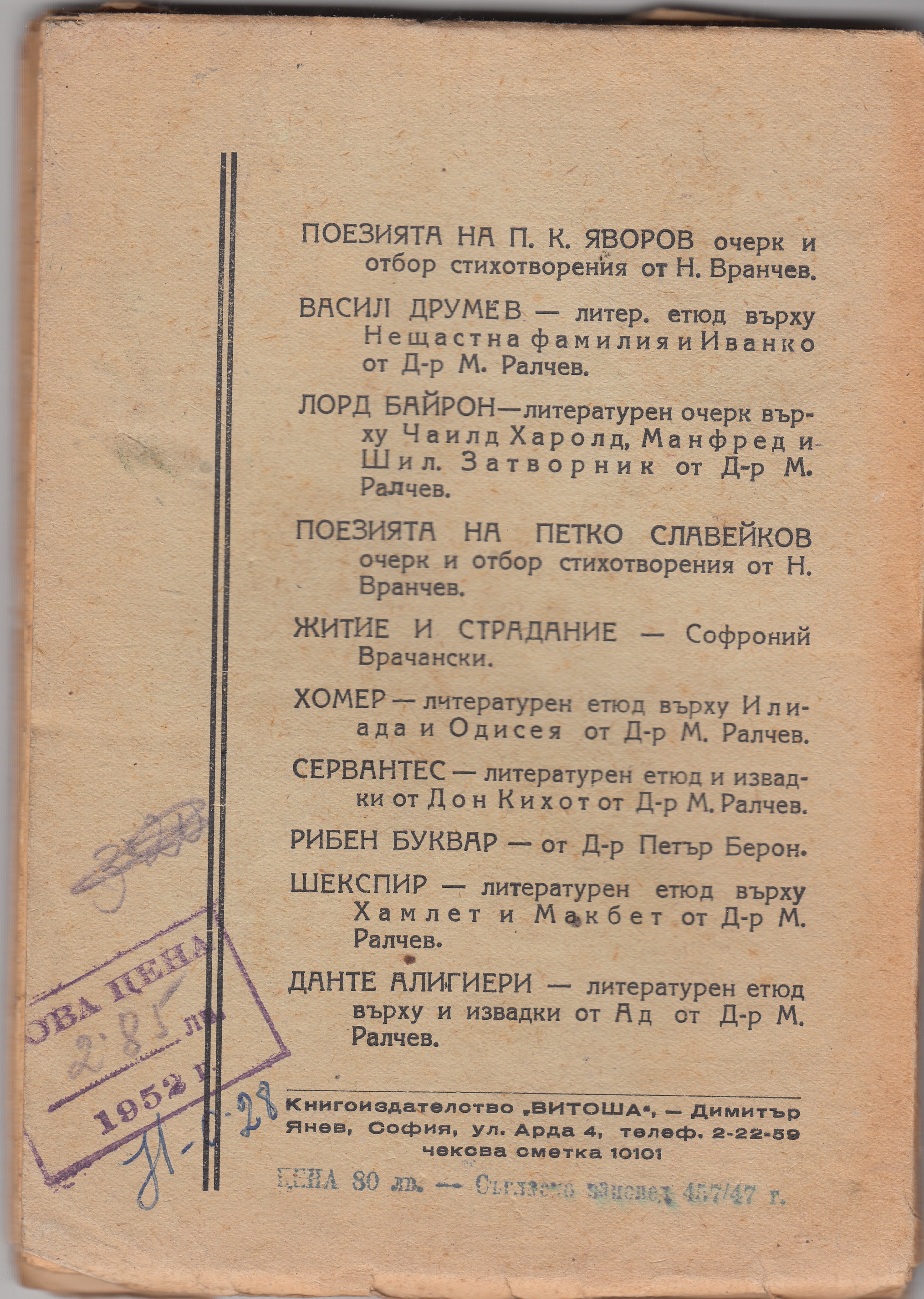 На гърба на книгата – печат Нова цена 2,85лв от 1952 година; Н-о,28