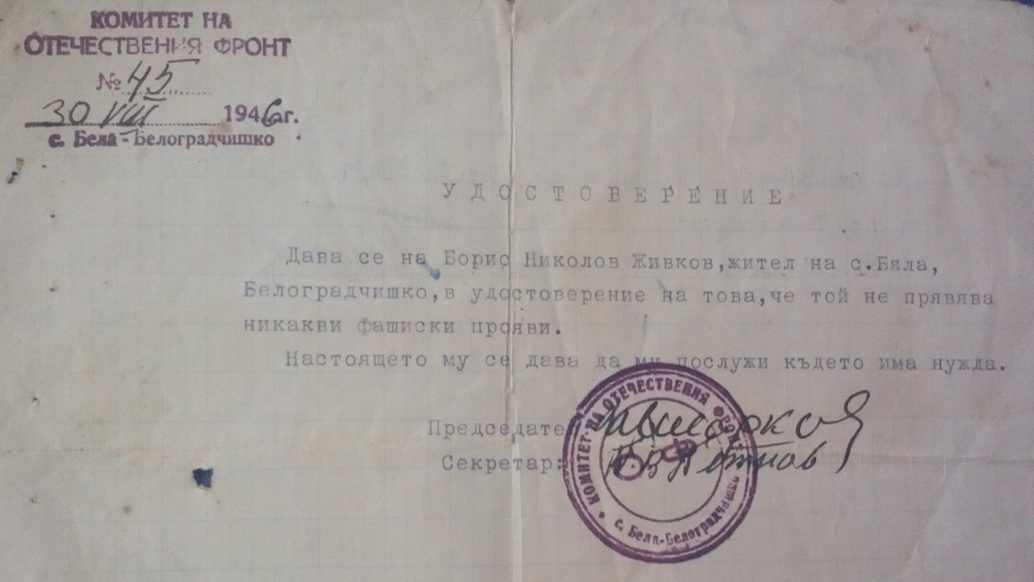 Дава се Борис Николов Живков, жител на с.Бела, Белоградчишко, в удостоверение на това, че той не проявява никакви фашистки прояви.