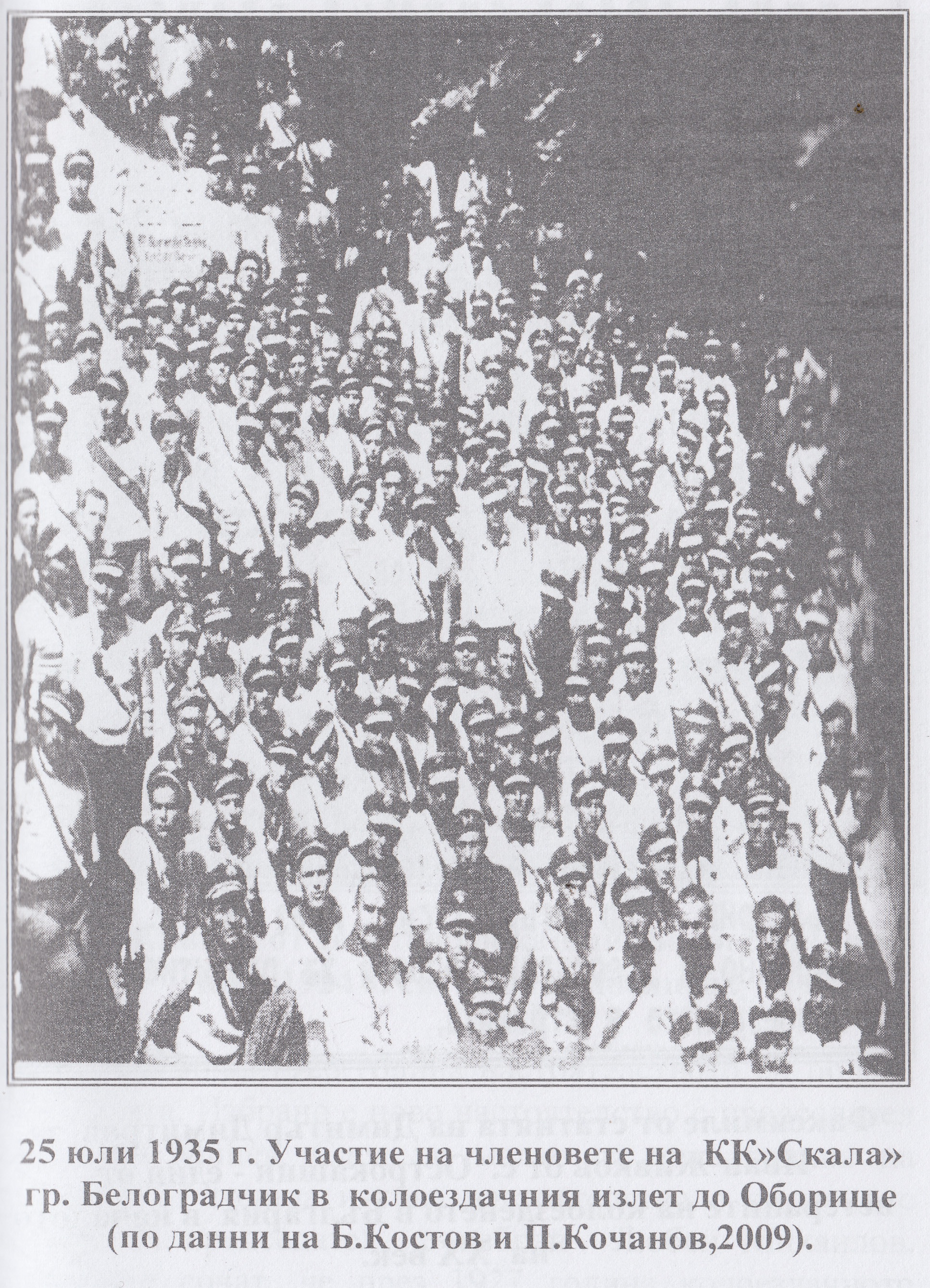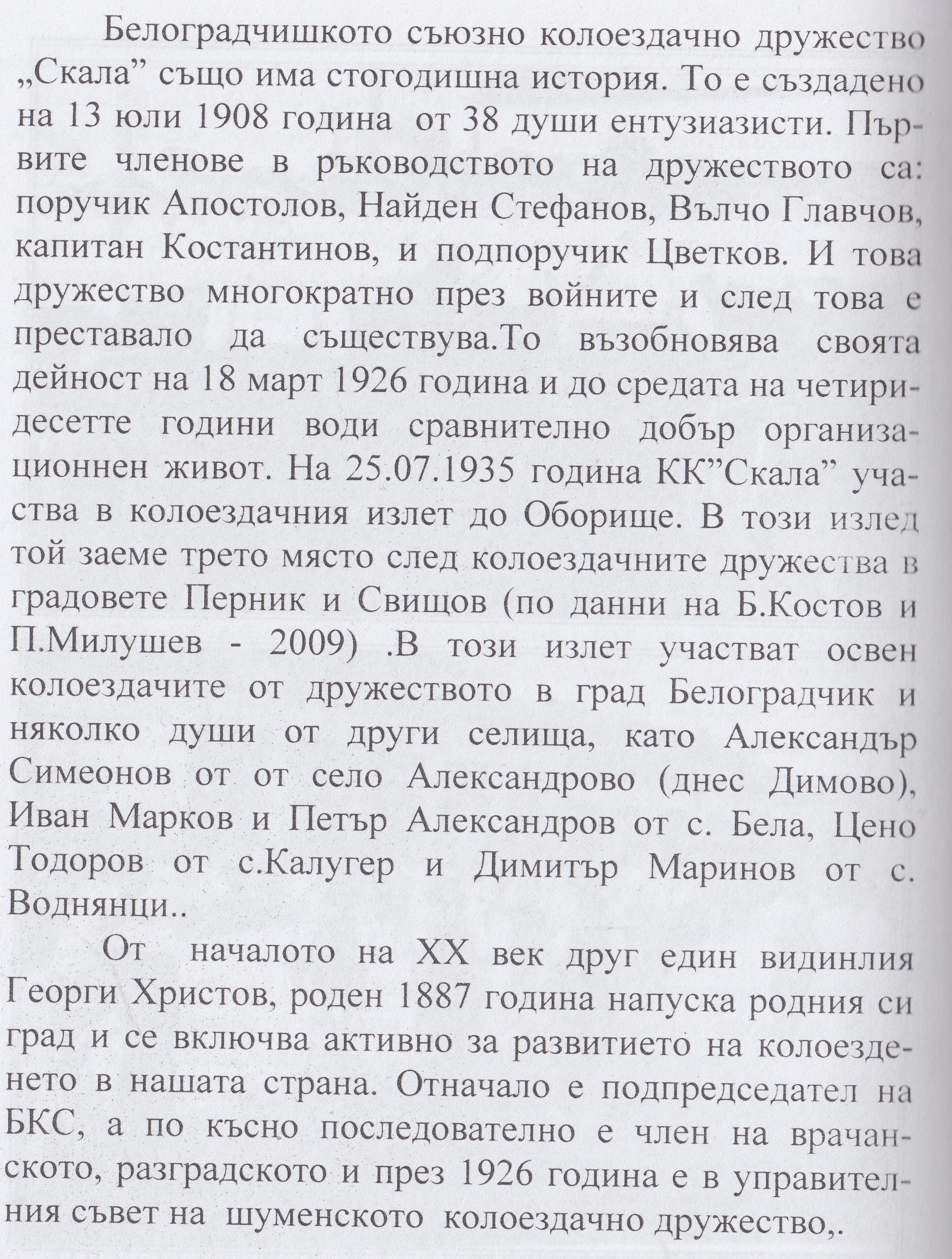 “ Белоградчишкото съюзно колоездачно дружество „Скала“ също има стогодишна история.То е създадено на 13 Юли 1908 година от 38 души ентусиасти.Първите членове в ръководството на дружеството са: Поручик Апостолов ; Найден Стефанов ; Вълчо Главчов ; капитан Константинов и подпоручик Цветков. И това дружество многократно през войните и след това е преставало да съществува. То възобновява своята дейност на 18 Март 1926 година и до средата на четиридесетте години води сравнително добър организационен живот. На 25.07.1935 година КК“СКАЛА“ участва в колоездачния излет до Оборище. В този излет той заема трето място след колоездачните дружества в градовете Перник и Свищов ( по данни на Б.Костов и П.Милушев – 2009г.). В този излет участват освен колоездачите от дружеството в град Белоградчик и няколко души от други селища, като Александър Симеонов от село Александрово (Димово), Иван Марков и Петър Александров от село Бела, Цено Тодоров от с.Калугер и Димитър Маринов от село Воднянци…..“