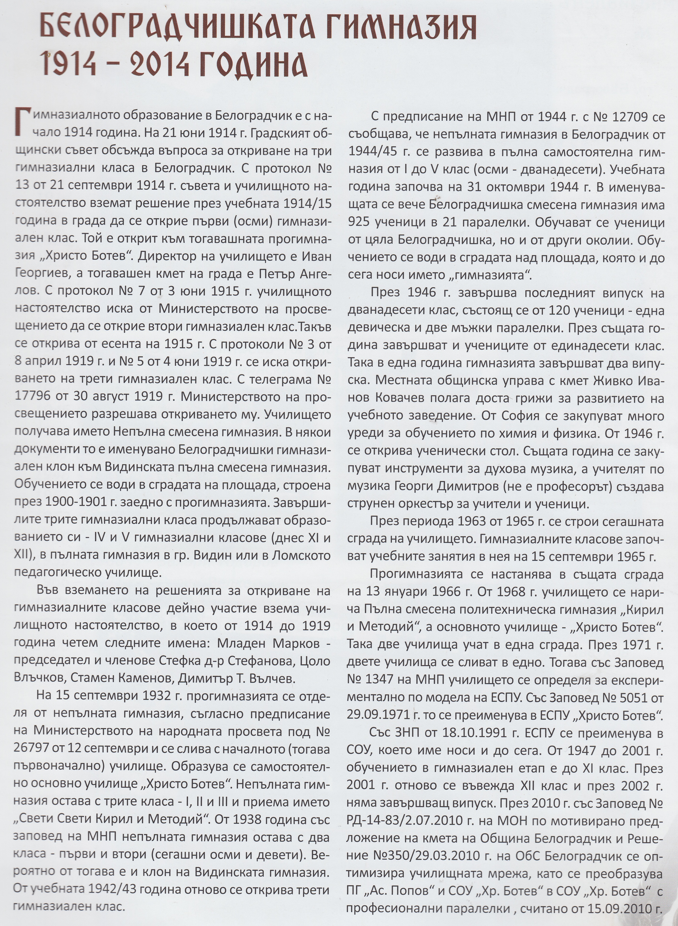 100 ГОДИНИ ГИМНАЗИАЛНО ОБРАЗОВАНИЕ В БЕЛОГРАДЧИК