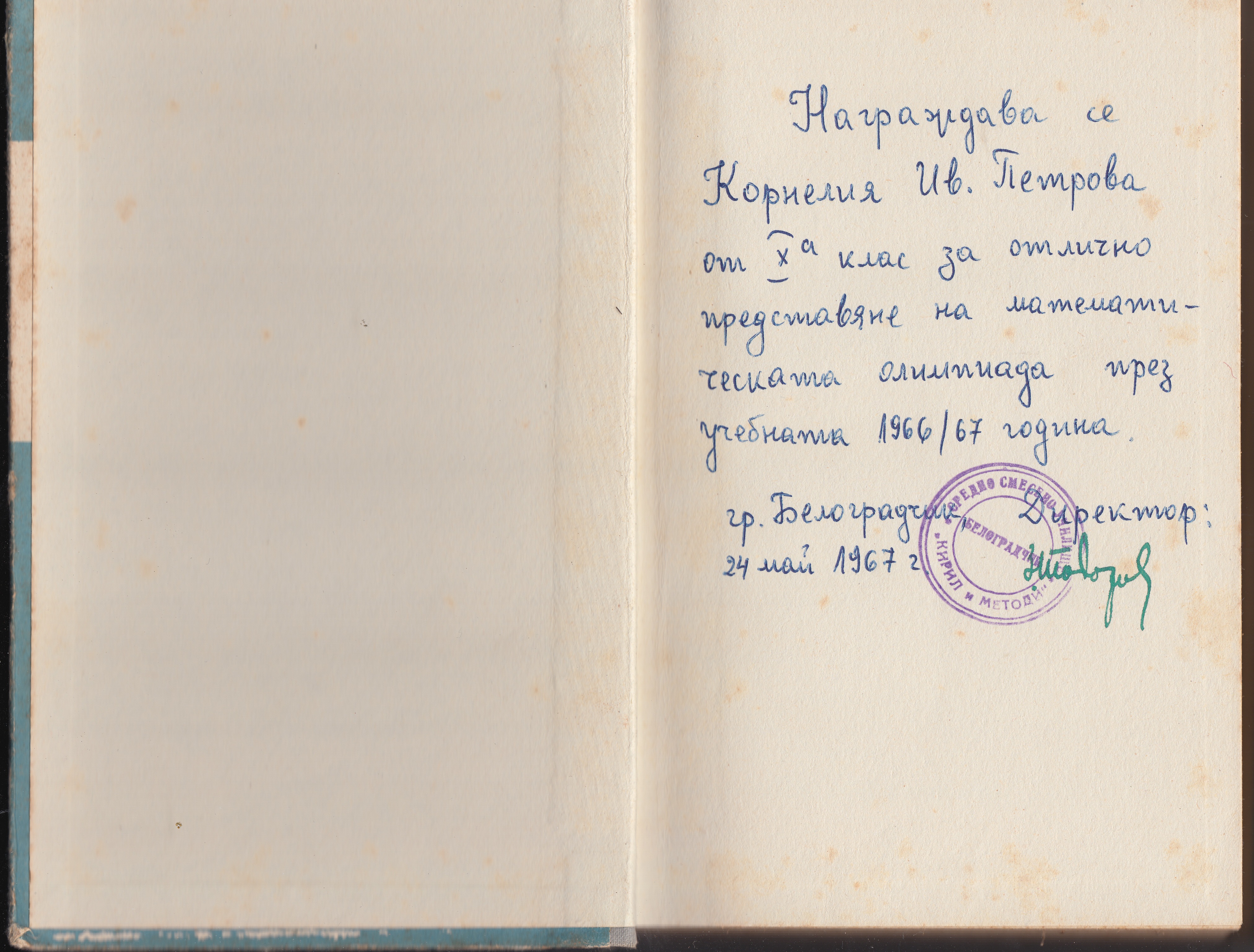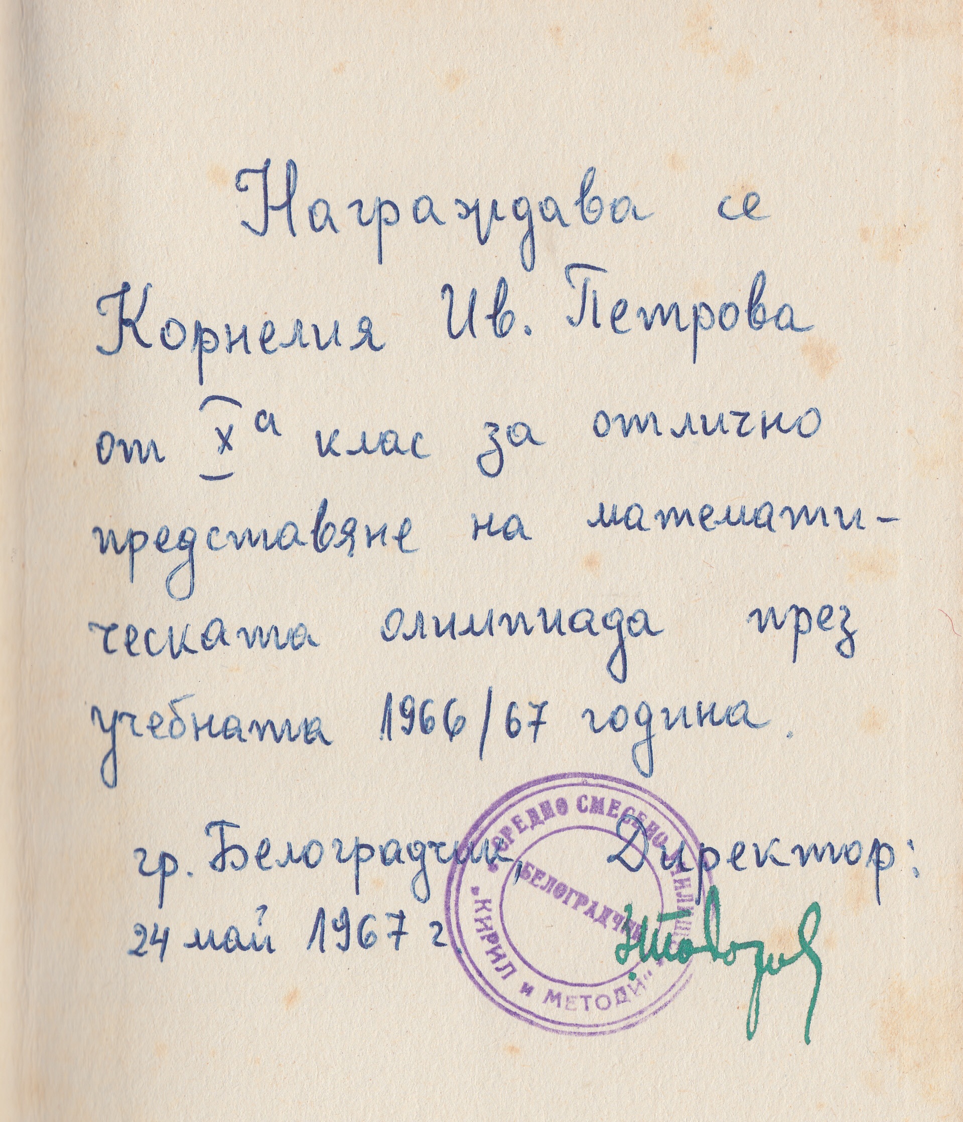 Награждава се Корнелия Ив.Петрова от 10-А клас,за отлично представяне на математическата олимпиада през учебната 1966/67 година.