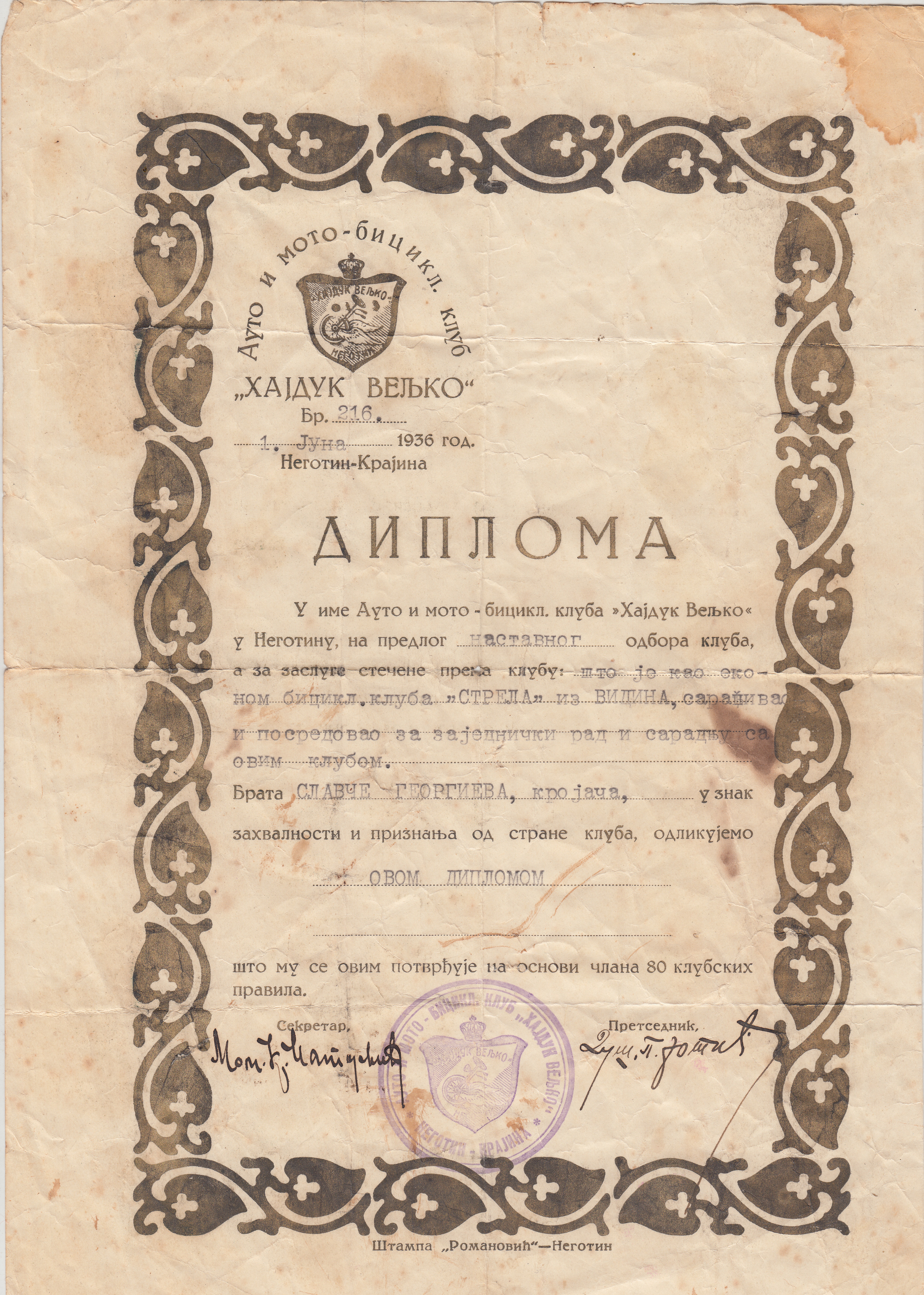 Издадена от Авто и мото – бицикл.клуб “ Хайдук Велко“ гр.Неготин 1 Юни 1936 год.