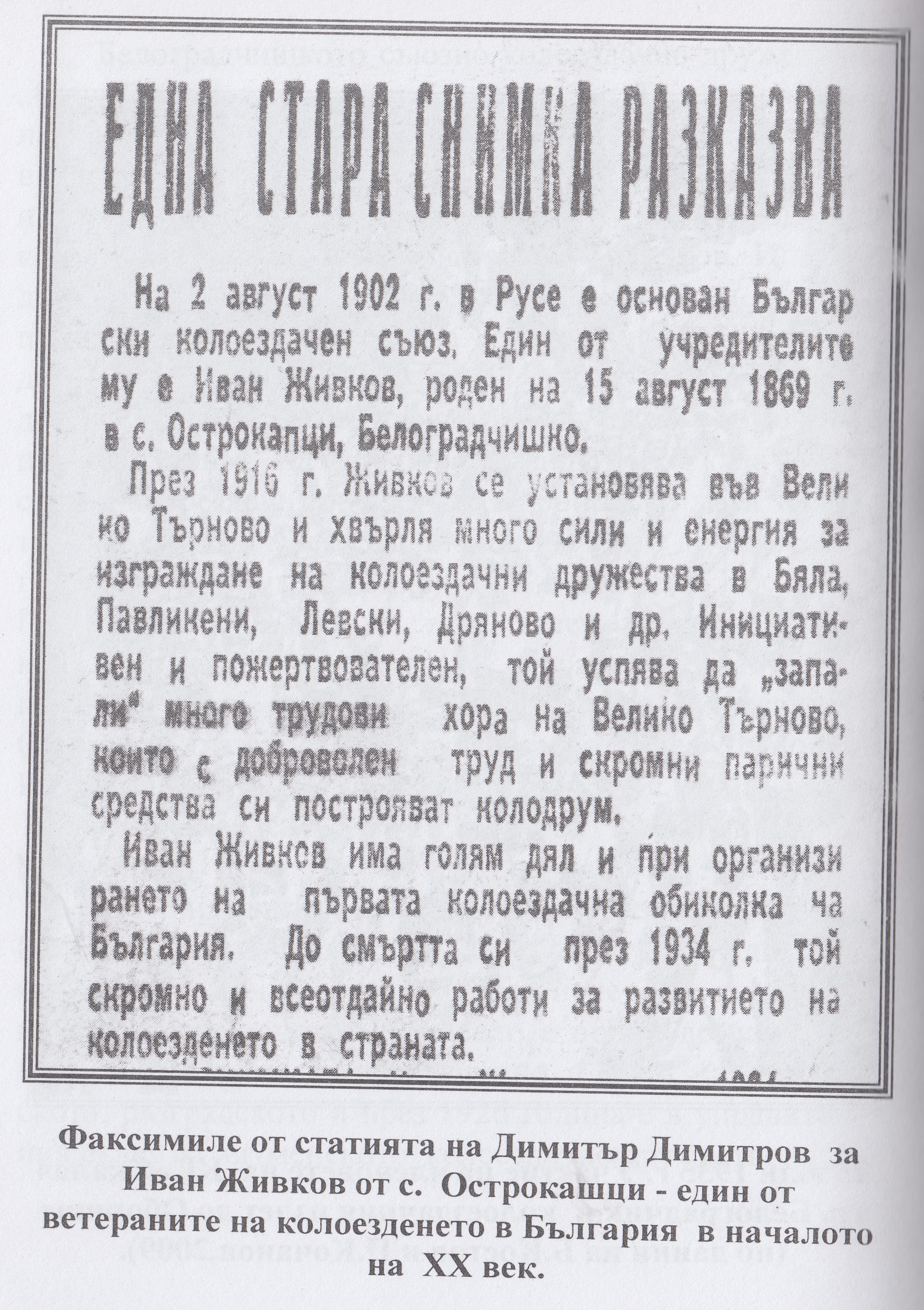 Факсимиле от статията на Димитър Димитров за Иван Живков от село Острокапци – един от ветераните на колоезденето в България в началото на 20 век.