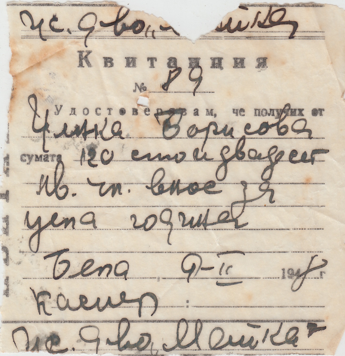 Удостоверявам че получих от Ценка Борисова 120 лева члвнски внос за цяла година , касиер на ЖЕНСКО ДРУЖЕСТВО „МАЙКА“ село Бела 09.02.1948 г.