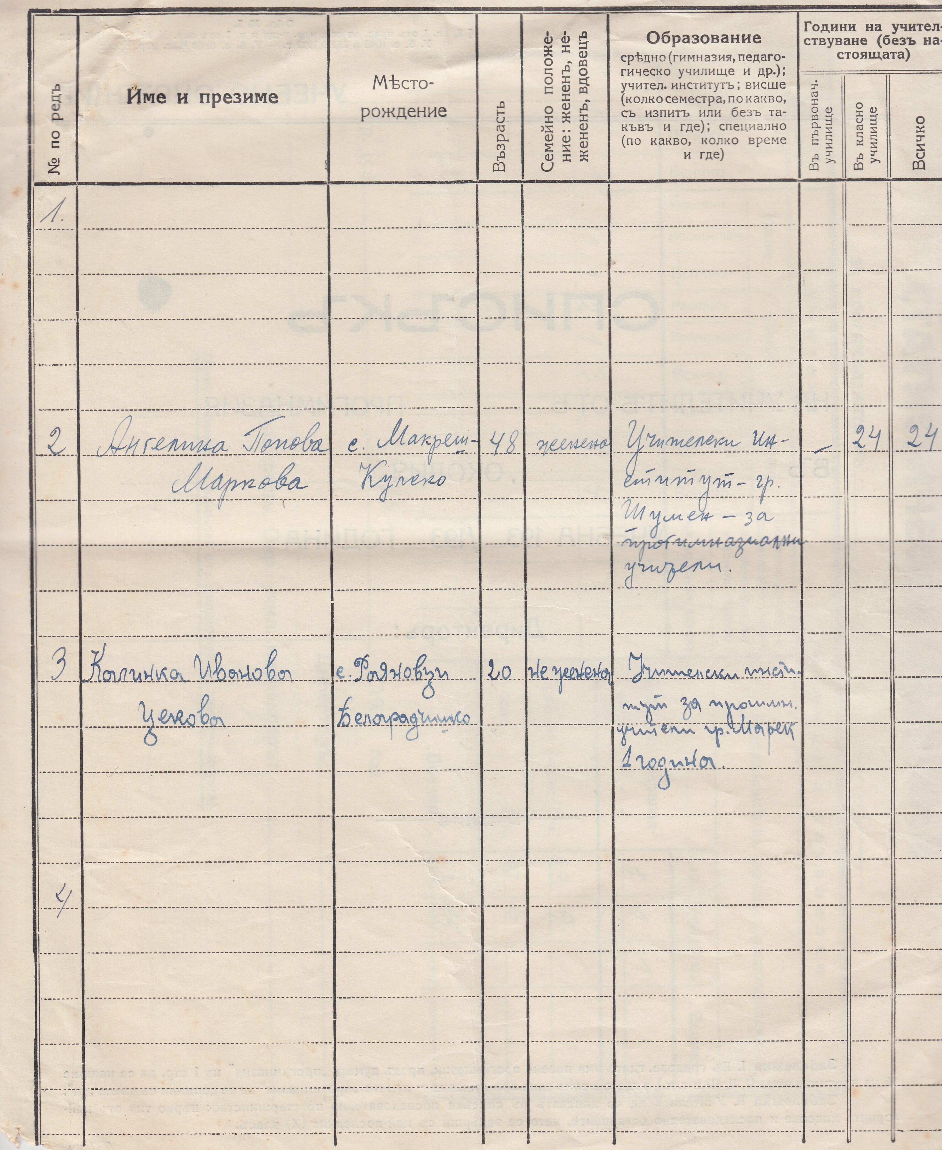 2. Ангелина Попова Маркова с.Макреш, Кулско. 48 годишна , Учителски институт гр.Шумен – за прогимназиални учителки.