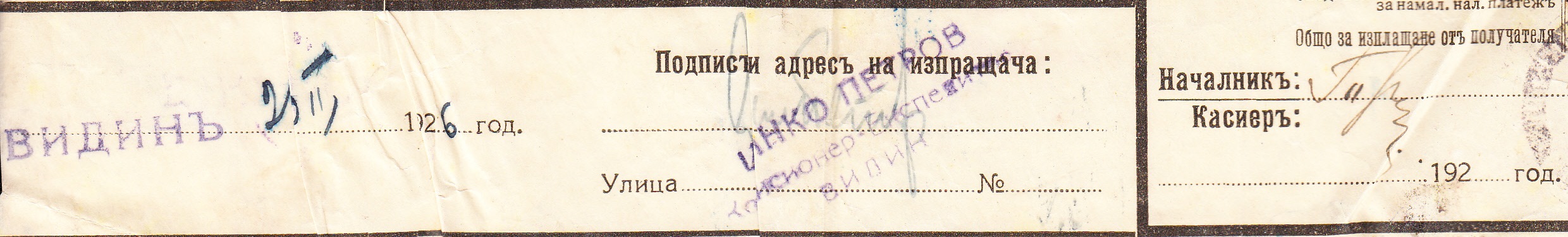 Изпращач: ИНКО ПЕТРОВ – комисионер спедитор гр.Видин 20.02.1926г.
