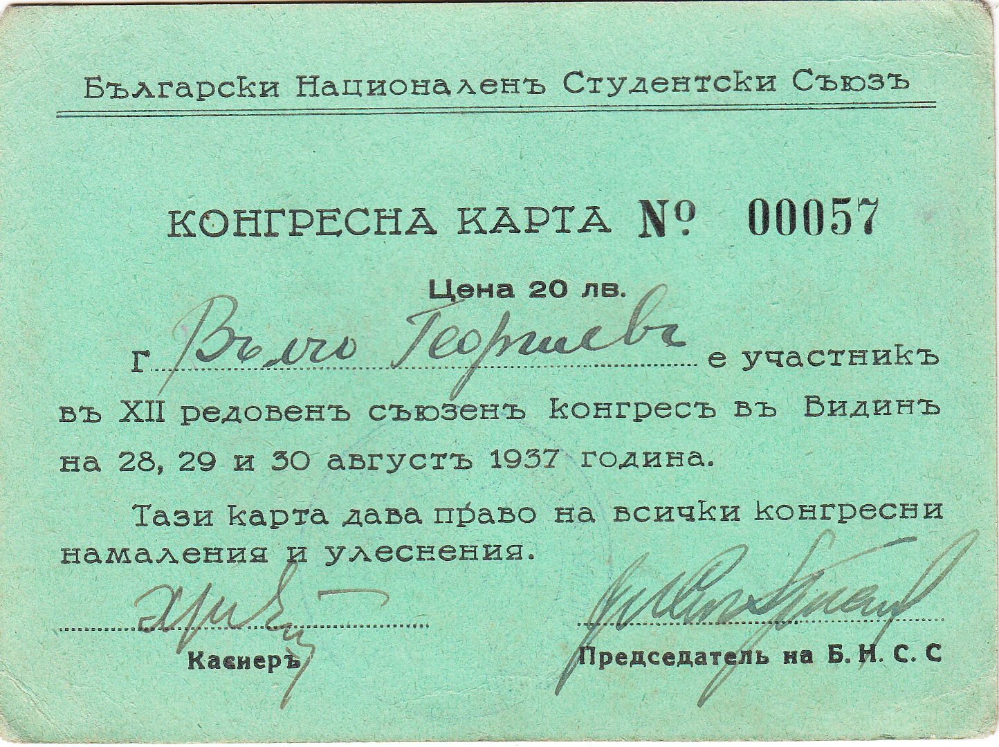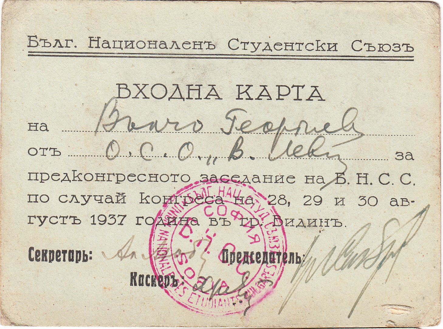 Входна карта за предконгрсно заседание на Б.Н.С.С. по случай конгреса в град Видин 28,29,30 Август 1937 година.