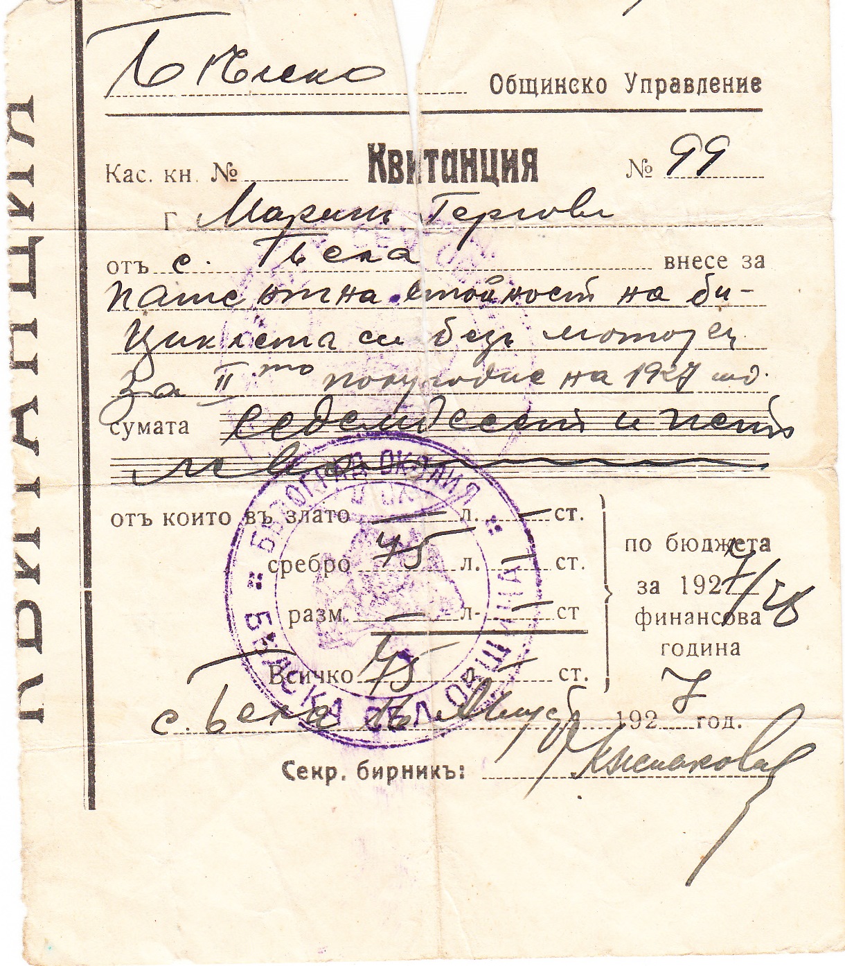Патент на стойност на бициклет без мотор за 1927 г. второто полугодие.