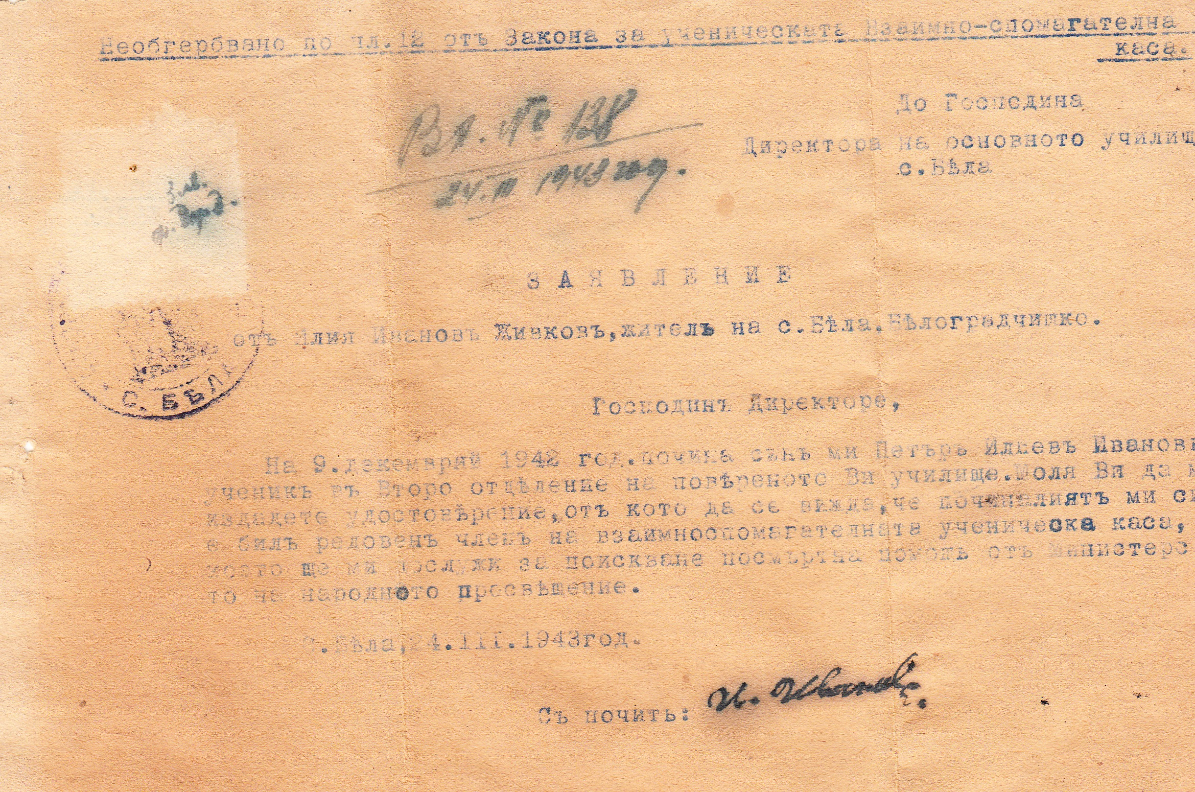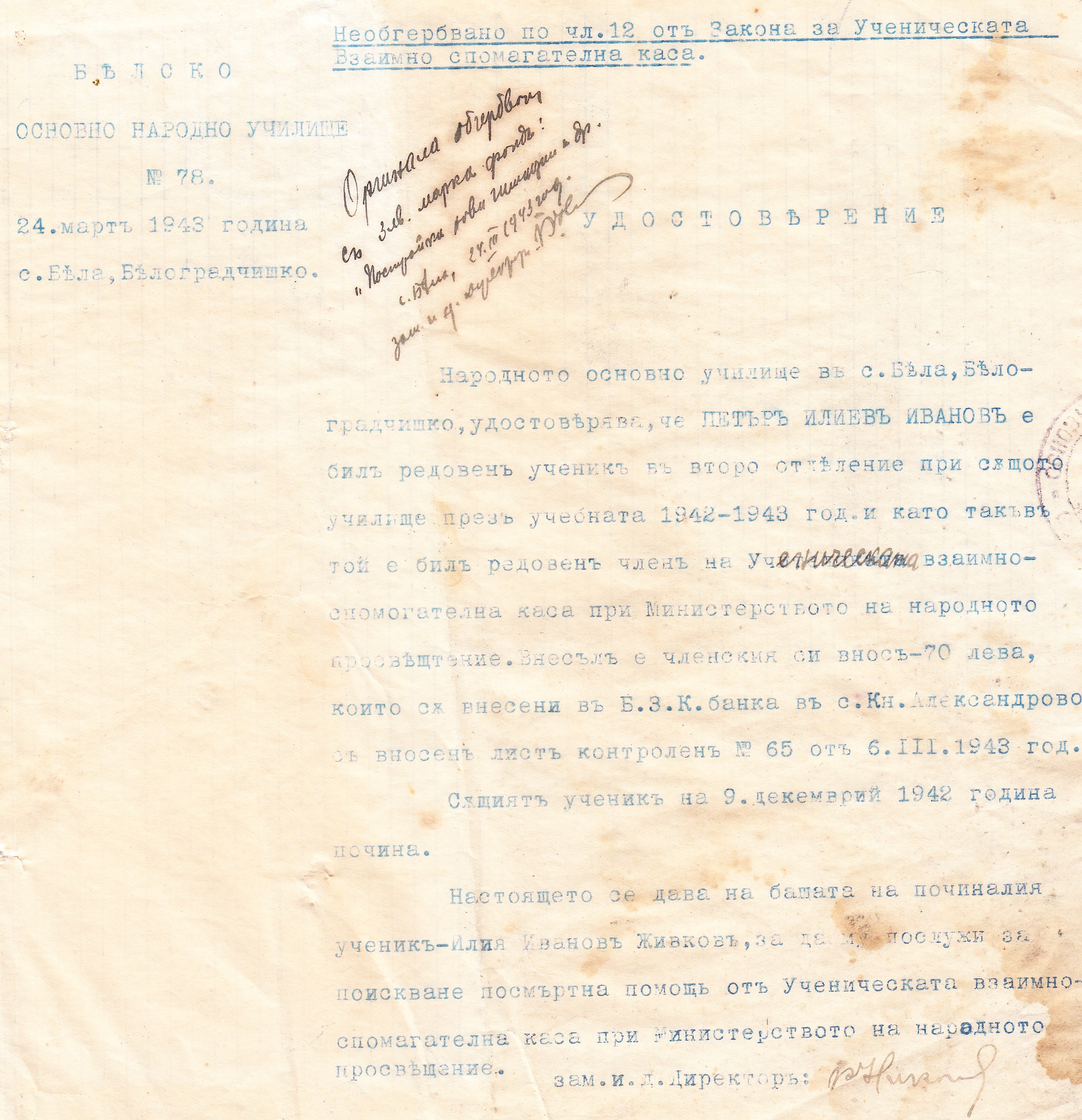 Народното основно училище село Бела, Белоградчияко удостоверява, че Петър Илиев Иванов е бил редовен ученик във второ отделение през учебната 1942/43 година.Бил е редовен член на Ученическата Взаимноспомагателна Каса.