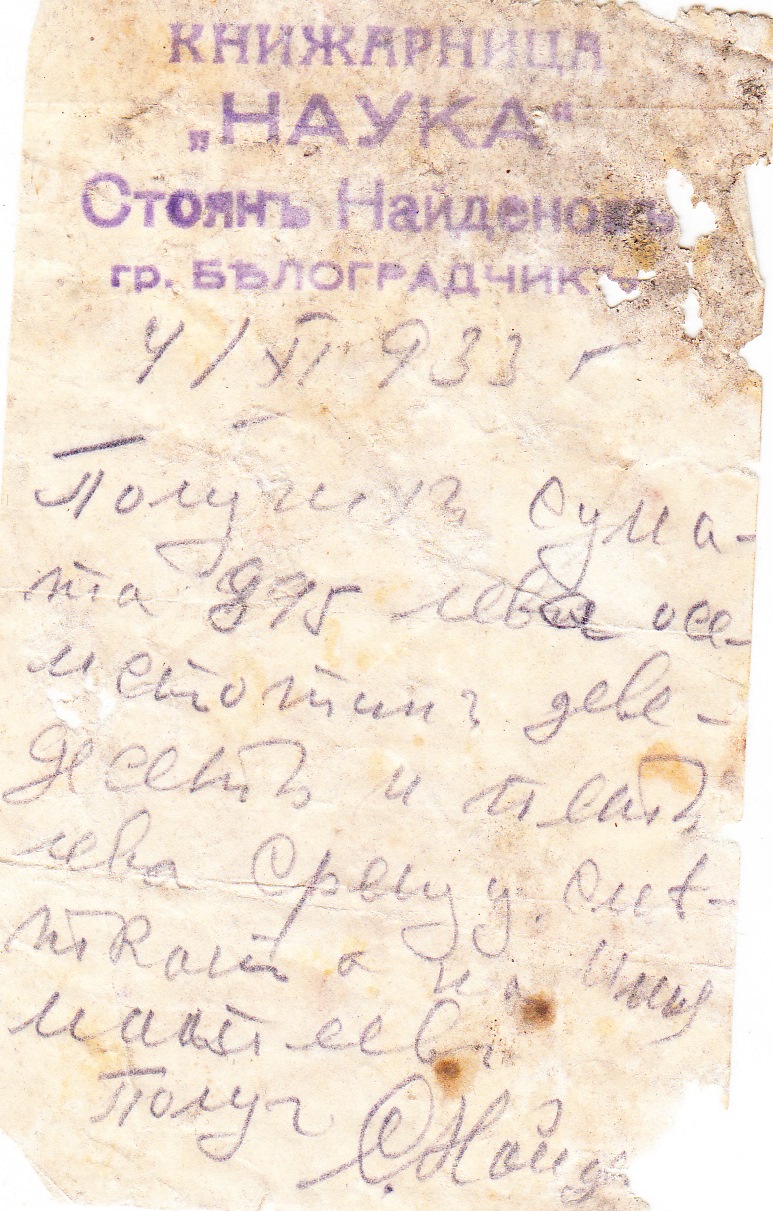 Подписаният Иван П.Стоянов, удостоверявам че получих от Ученическата Кооперация село Бела сумата от 150 лева, срещу сметката на брат си Стоян Найденов книжар гр.Белоградчик.