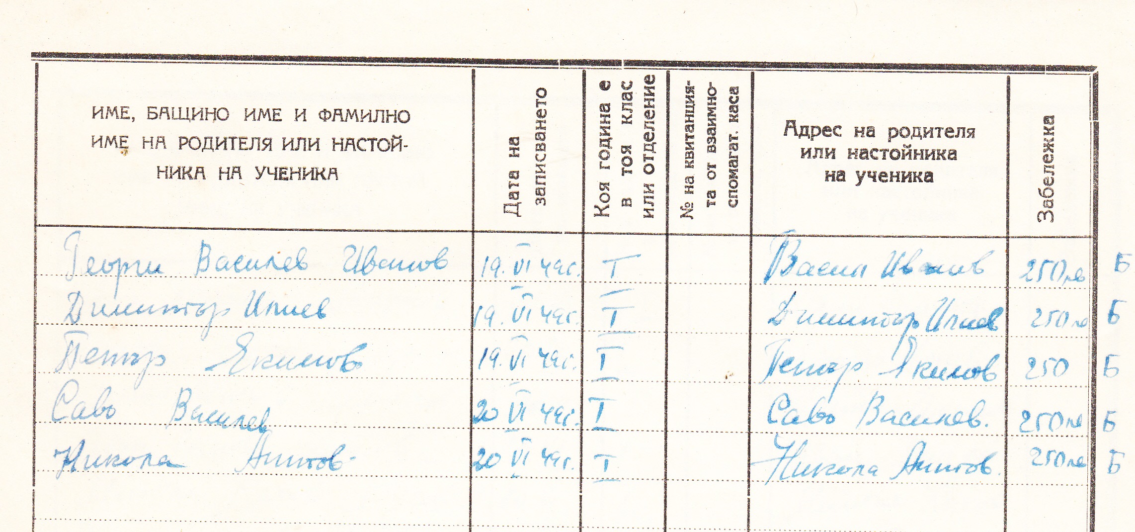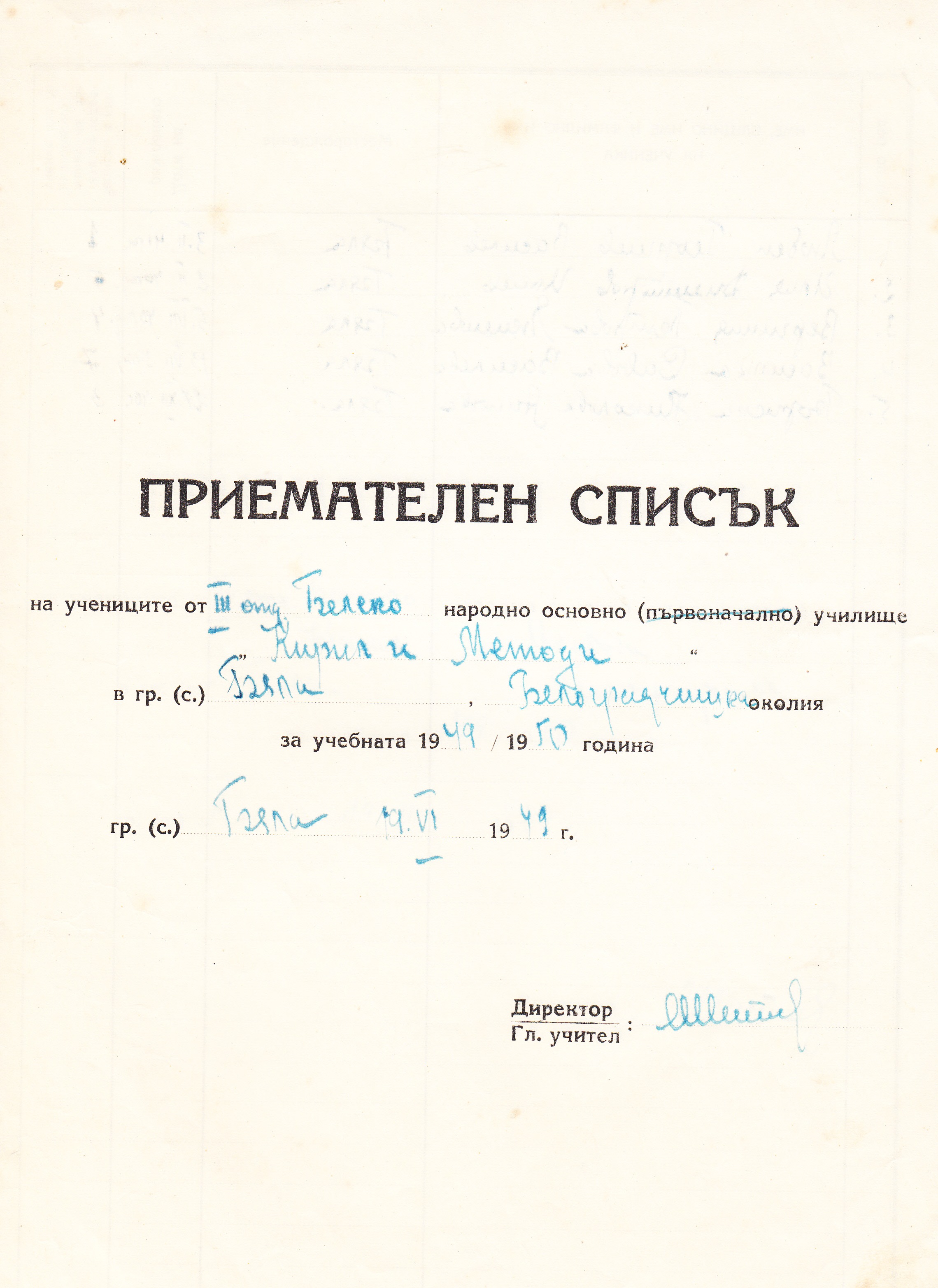 1949 год. 19 Юни – ПРИЕМАТЕЛЕН СПИСЪК на учениците от трето отделение при Белското основно училище „КИРИЛ и МЕТОДИ“, Белоградчишко за учебната 1949/50 година.