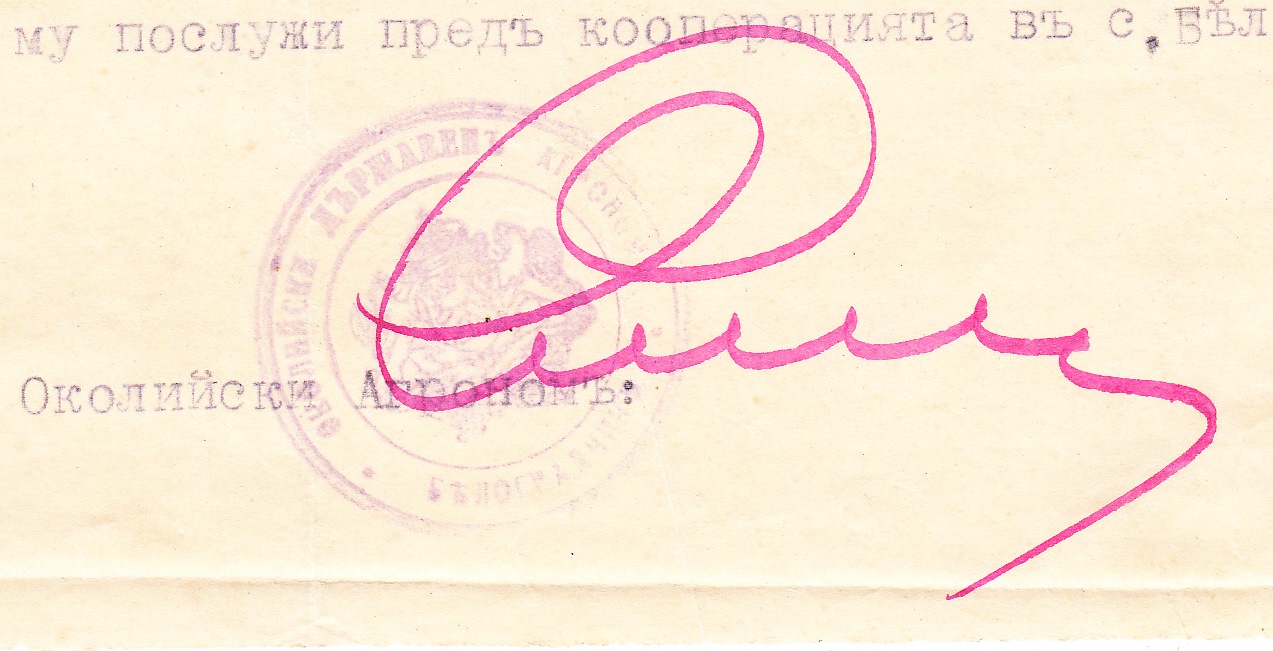Белоградчишкото Околийско Агрономство дава настоящето на Славчо Стаменов Киров от село Бела, Белоградчишко в уверение на това, че от 1 Март 1940 година до днес, съгласно заповед N973 / 24.02.1940 година на Министерството на Земеделието и Държавните Имоти той е техник по птицевъдството при околийското агрономство в гр.Белоградчик……..