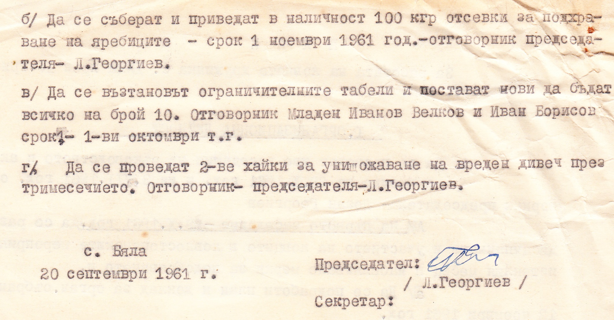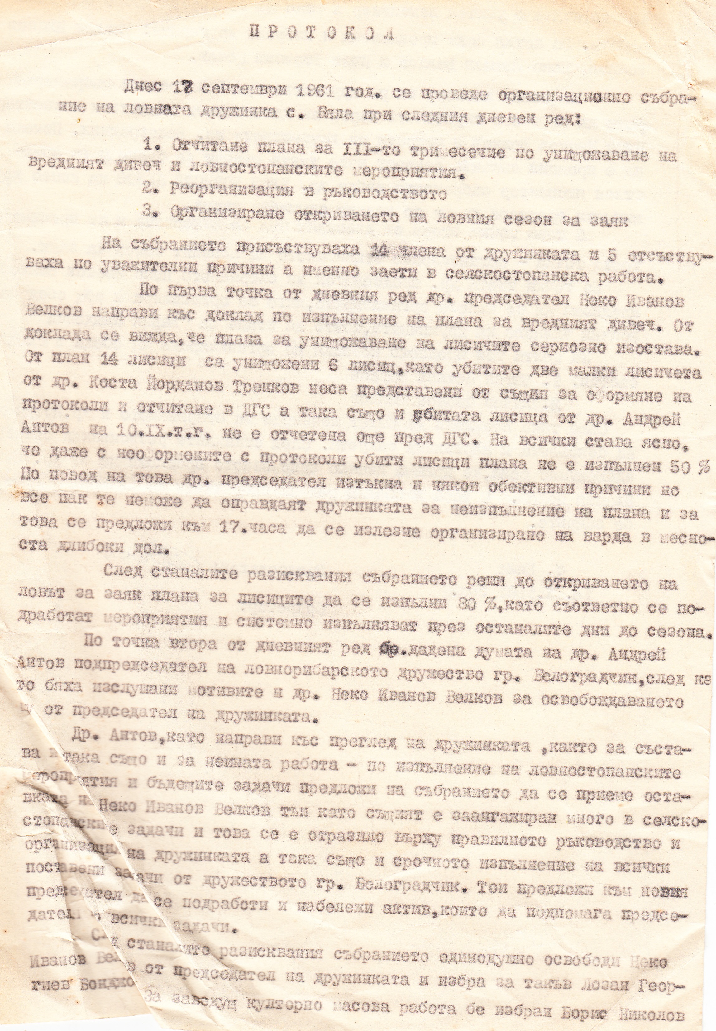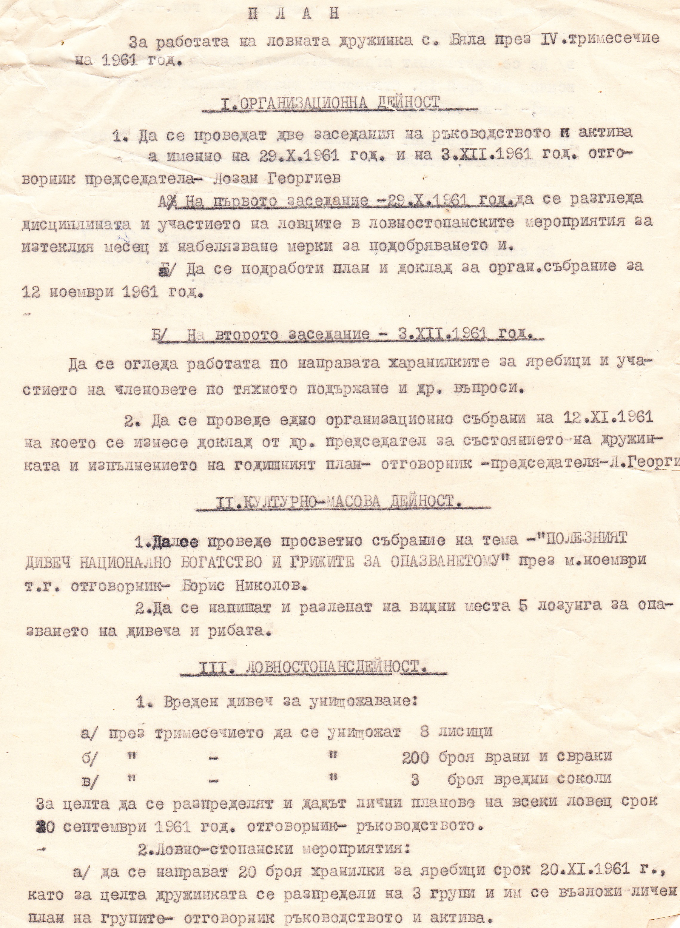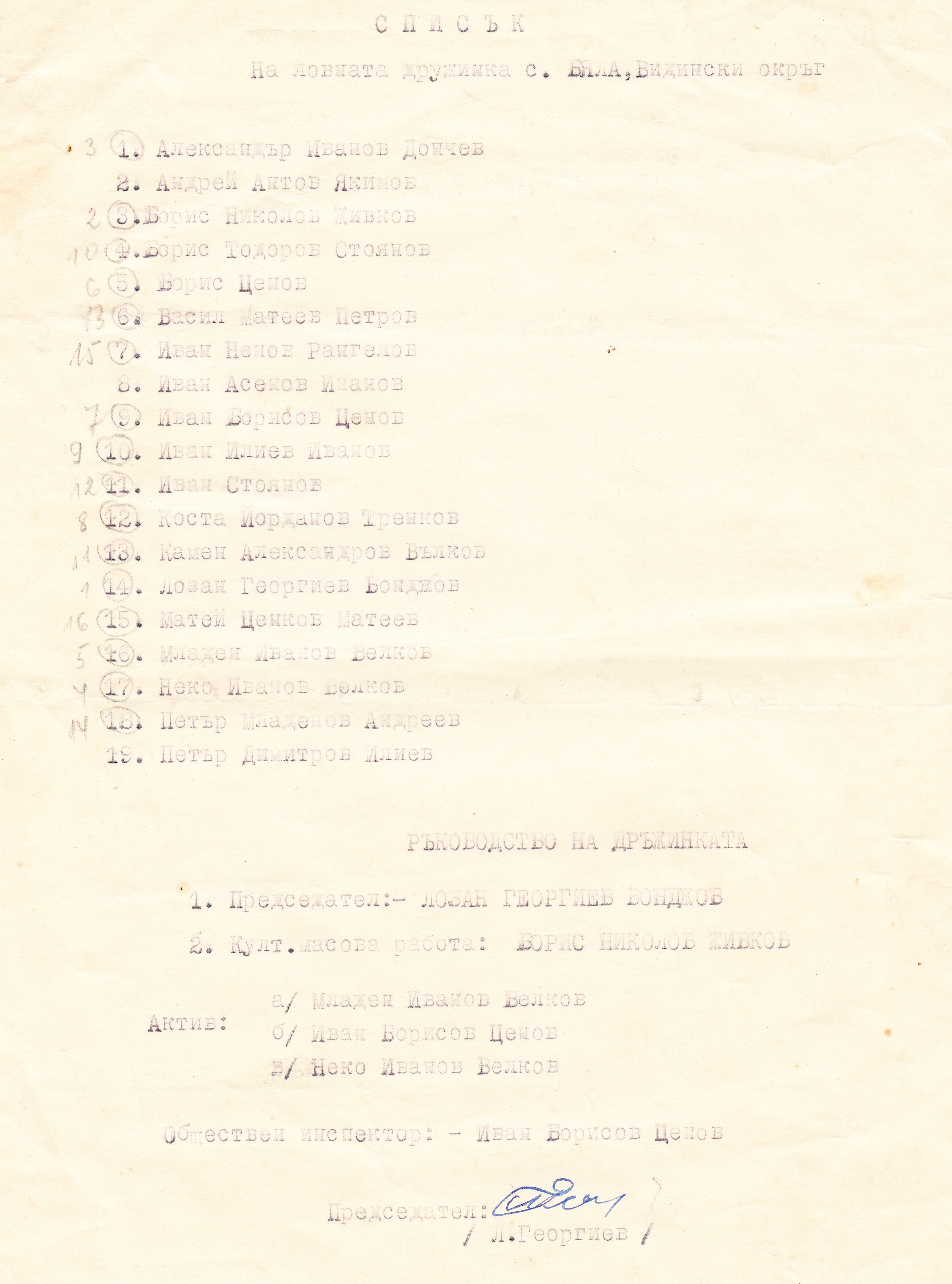 - Освобождава се от предедател на ловната дружинка другаря Неко Иванов Неков и се избира за председател Лозан Георгиев Бонджов