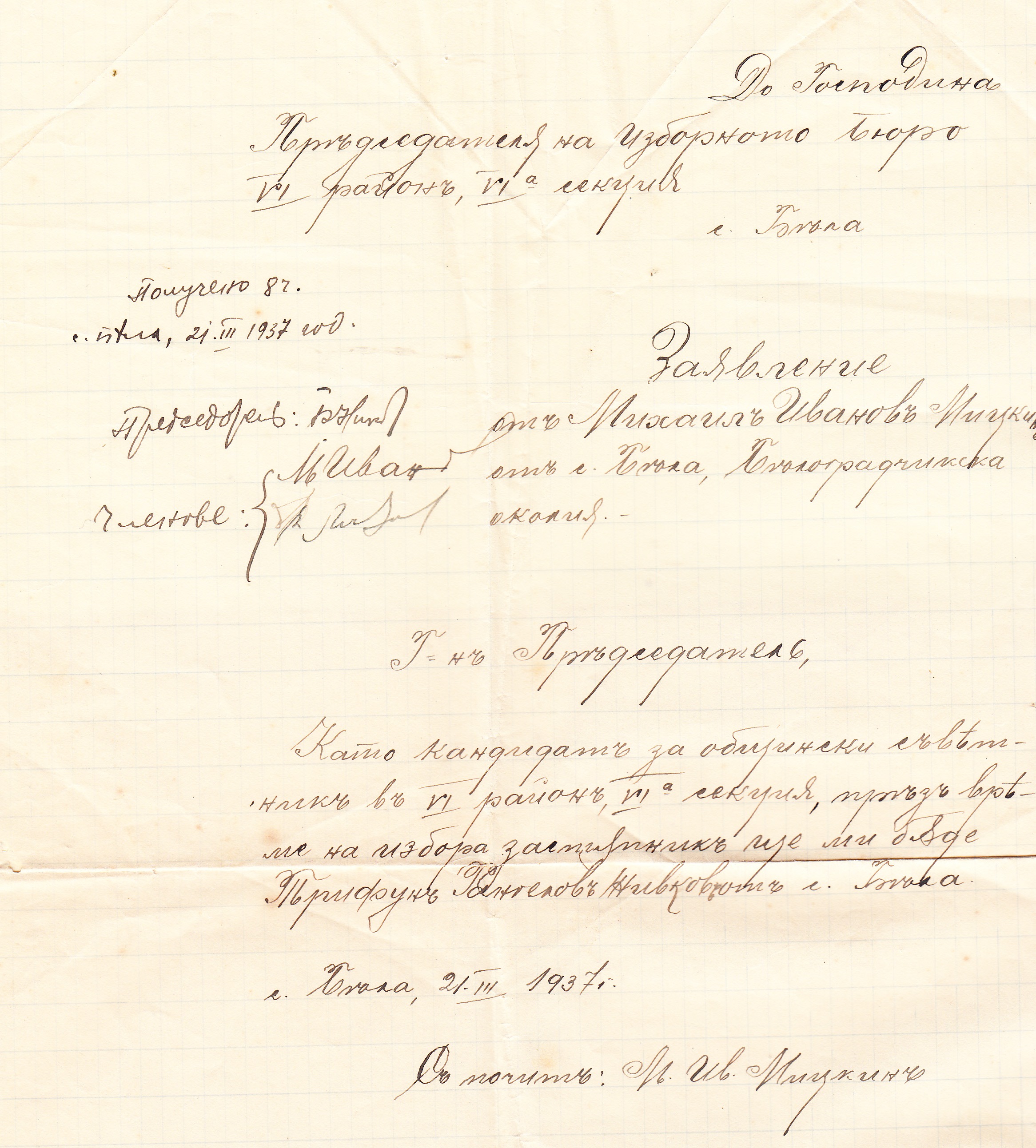 До господина председателя на изборното бюро 4-ти район, 4-та „А“ секция.
