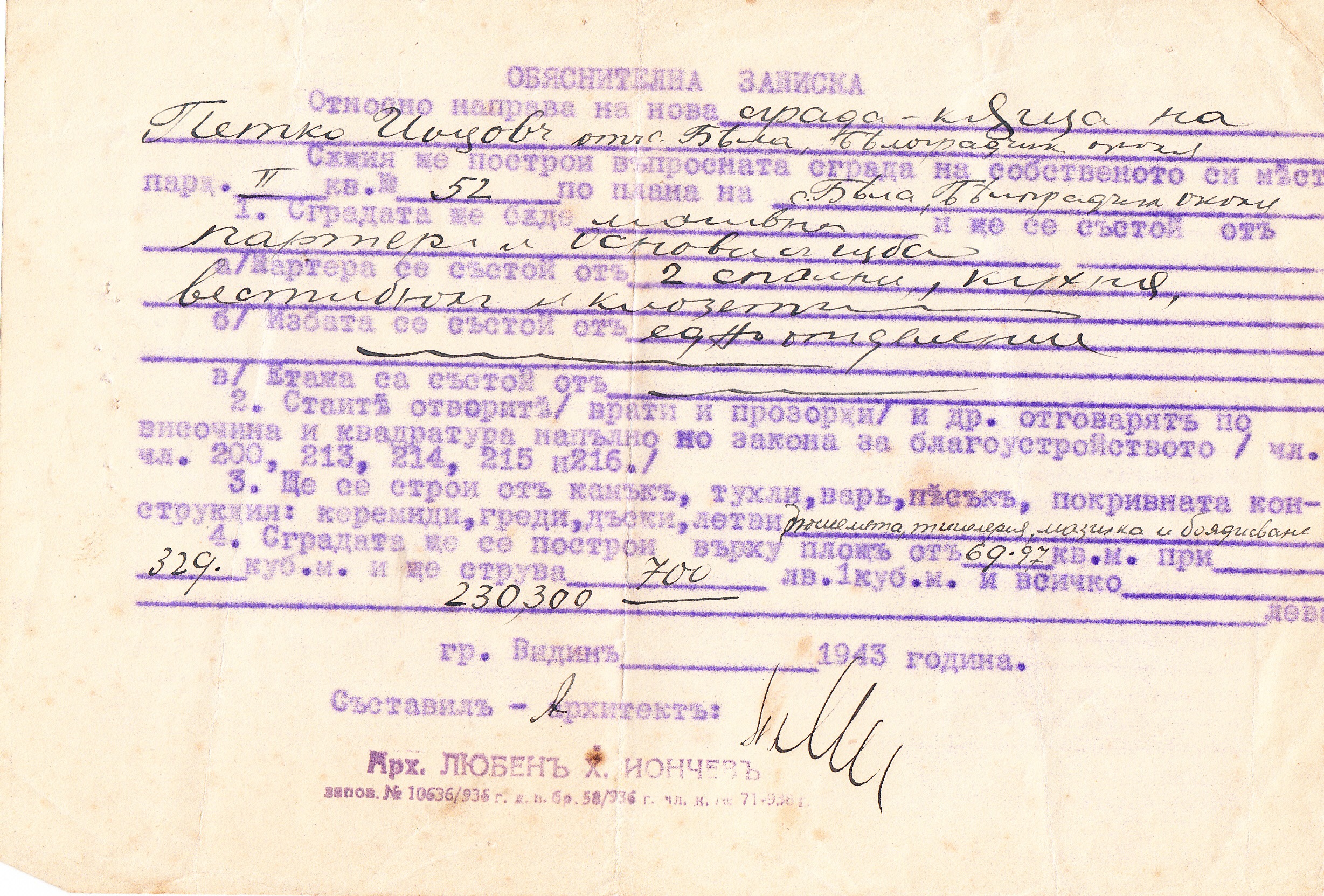 Арх. ЛЮБЕН Х. ЙОНЧЕВ – Видин – 1943 год.