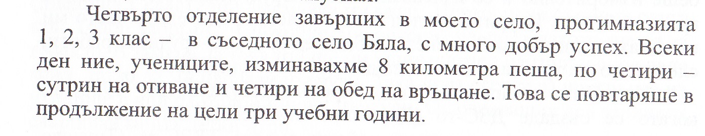 Четвърто отделение завърших в моето село/ с.Калугер/, прогимназията 1,2,3 клас – в съседното село Бела, с много добър успех…..