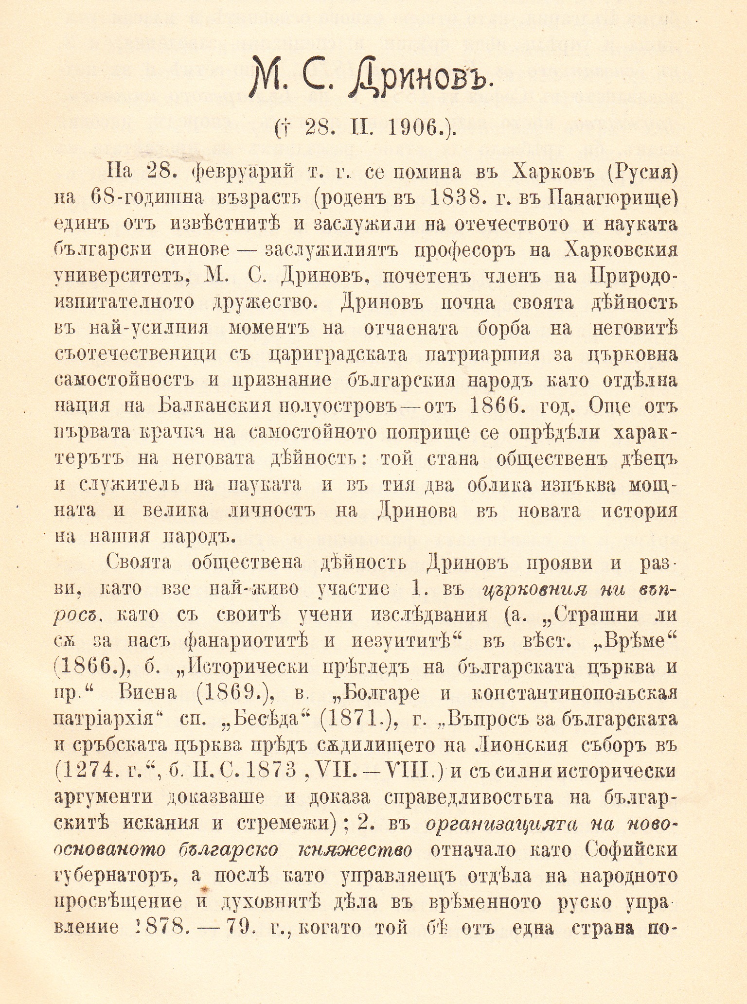 28.Февруари 1906 г. умира Марин С. Дринов заслужил професор в Харковския Императорски Университет