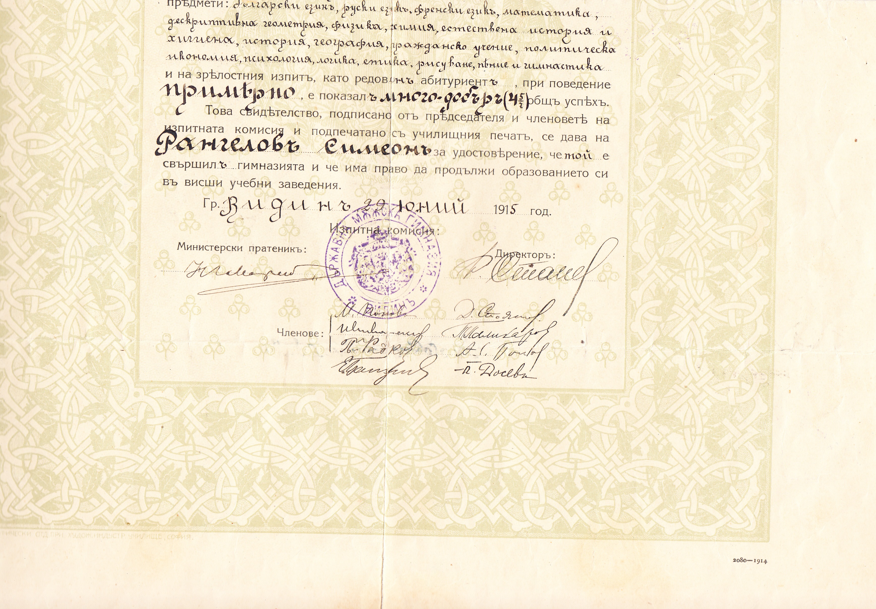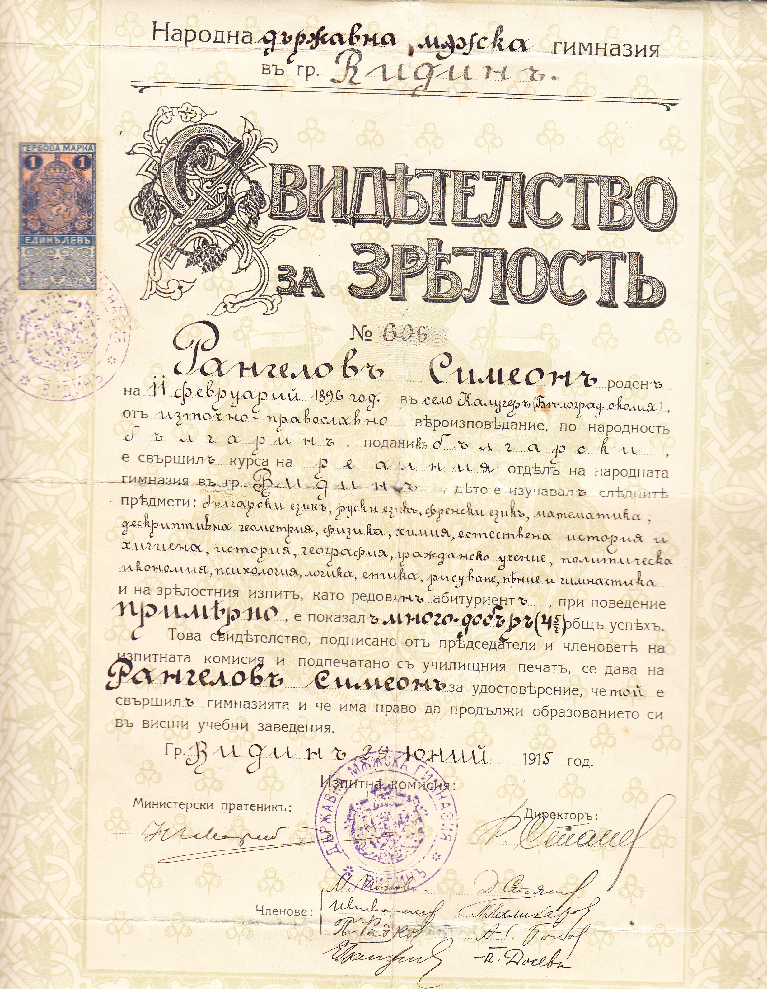 СВИДЕТЕЛСТВО ЗА ЗРЕЛОСТ на Симеон Рангелов Цветков от Народна Държавна Мъжка Гимназия гр. Видин под N606 от 29.Юний 1915 г.