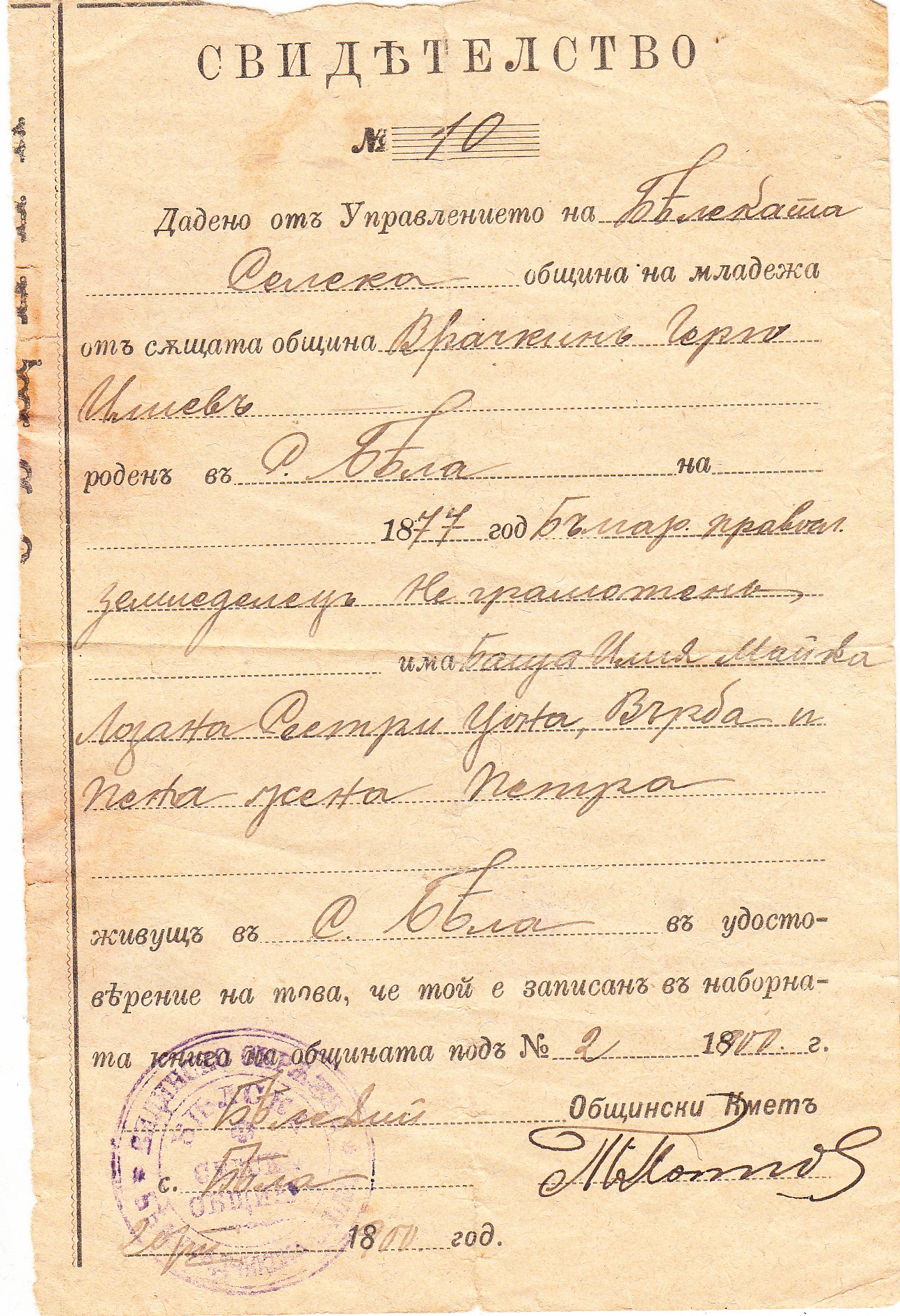 Живущ в село Бела, в удостоверение на това, че той е записан в наборната книга на общината под N 2 – 1900 г.