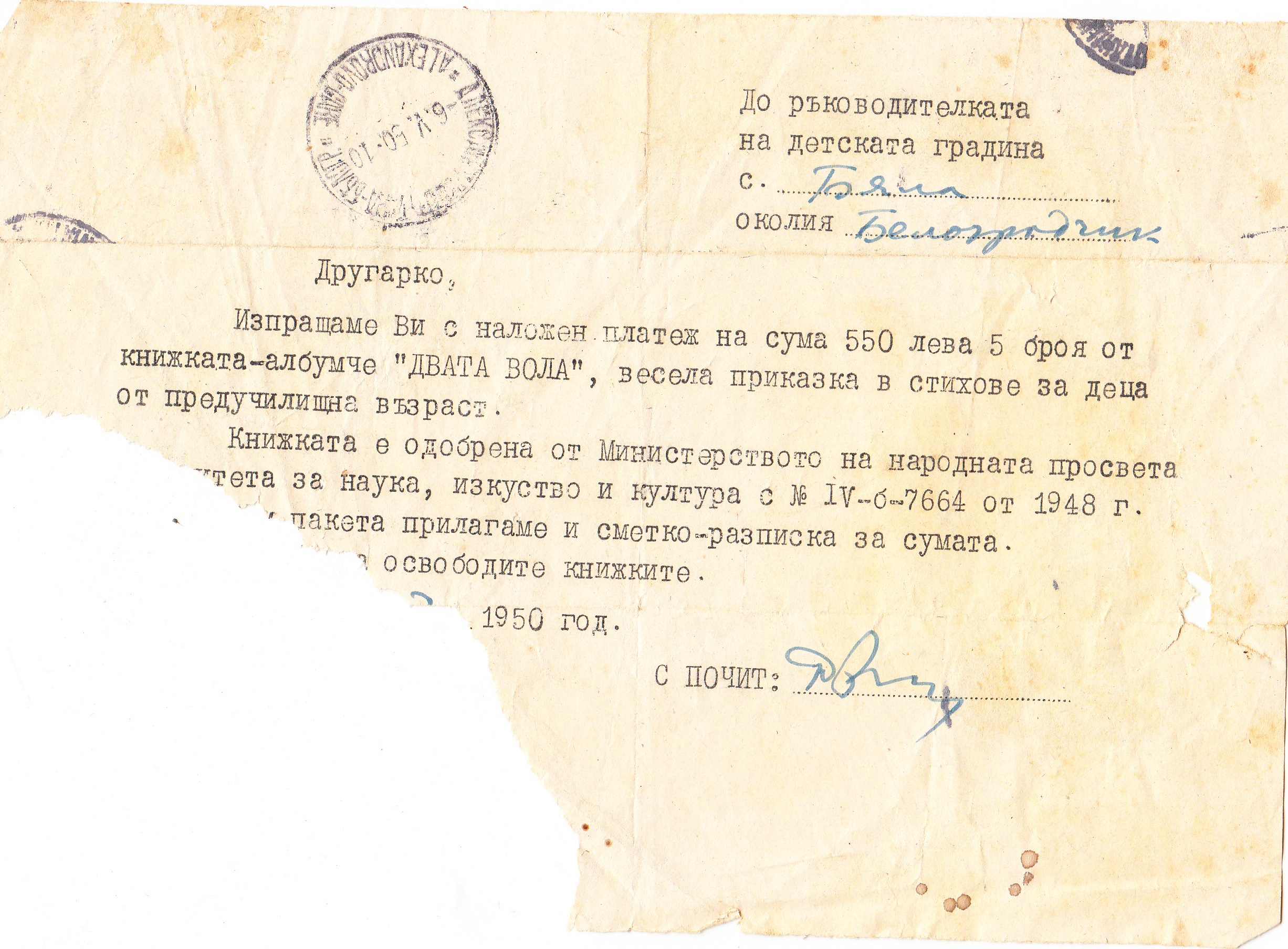 Изпращаме Ви с наложен платеж на сума 550 лева 5 броя от книжката албумче „ДВАТА ВОЛА“ , весела приказка в стихове за деца от предучилищна възраст…..