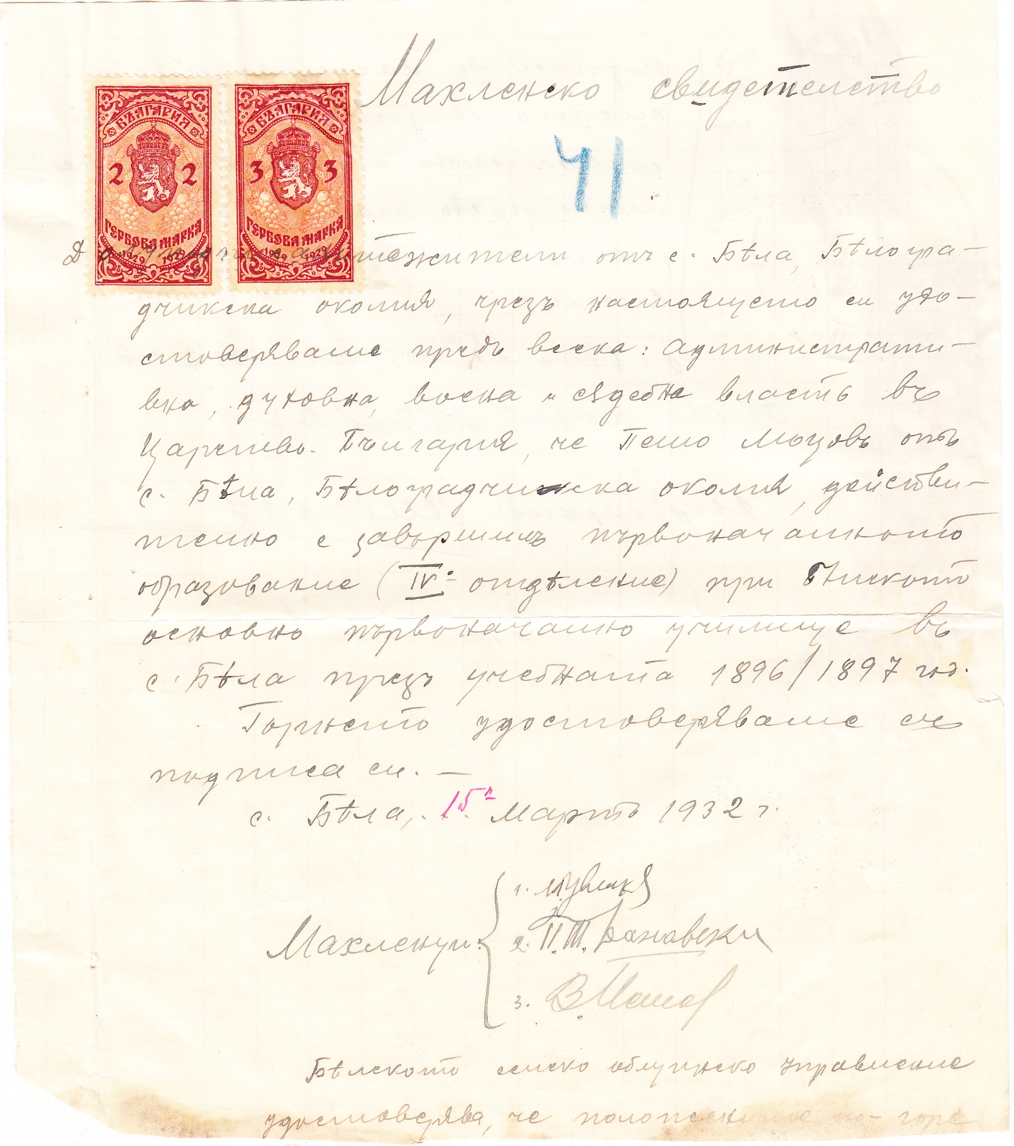1932 год. 15 Март – ЗАЯВЛЕНИЕ от Пешо Моцов до Главния Учител с.Бела, Белоградчишко