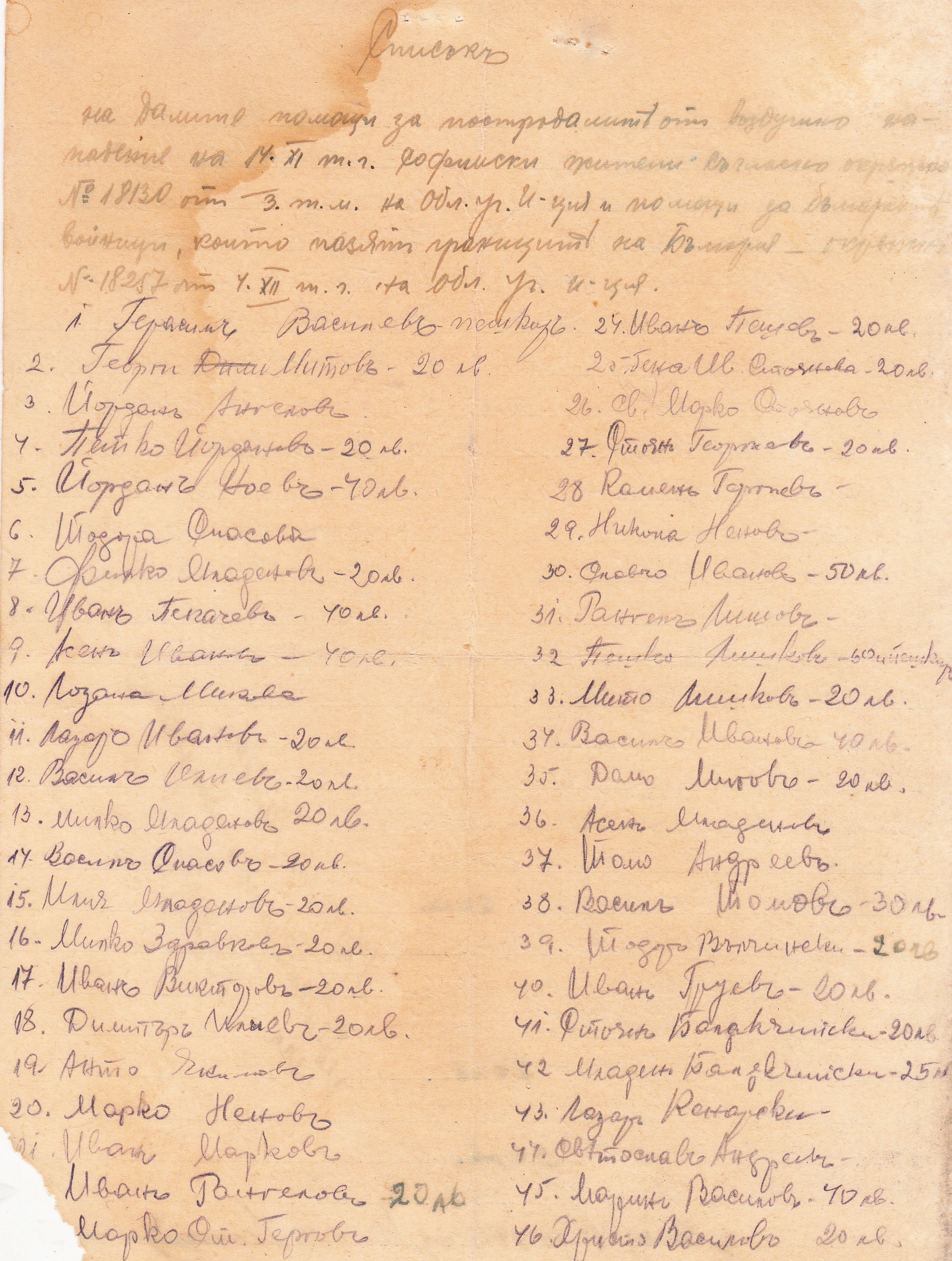 Георги Василев-пешкир, 2. Георги Митов – 20лв, 3.Йордан Ангелов, 4. Петко Йорданов – 20лв., 5. Йордан Новев- 40 лв., 6. Тодора Спасова, 7. Филко Младенов, 8. Иван Пекачев- 40 лв., 9. Асен Иванов – 40 лв., 10. Лозана Микова, 11. Лазар Иванов – 20лв., 12. Васил Илиев – 20лв., 13. Милко Младенов-20лв., 14. Велко Спасов – 20 лв., 15. Илия Младенов – 20 лв., 16. Милко Здравков – 20лв., 17.Иван Викторов-20лв., 18. Димитър Илиев-20лв., 19. Анто Якимов, 20. Марко Ненов, 21.Иван Марков, 22. Иван Рангелов-23лв., 22. Марко Стоянов Гергов, 24. Иван Пешев – 20лв., 25. Св.Марко Стоянов, 26. Стоян Георгиев-20лв., 27. Стоян Георгиев – 20лв., 28. Камен Георгиев, 29. Никола Ненов, 30.Славчо Иванов- 50лв., 31. Рангел Лишков, 32. Пешо Лишков- 60лв. и пешкир, 33. Мито Лишков-20лв., 34. Васил Иванов-40лв., 35. Демо Мигов- 20лв., 36. Асен Младенов, 37. Томо Андреев, 38. Васил Томов-30лв., 39. Тодор Вълчински- 20лв., 40.Иван Груев-20лв., 41. Стоян Балакчийски-20лв., 42. Младен Балакчийски-25лв., 43. Лазар Кенарски, 44. Светослав Андреев, 45. Марин Василев- 40лв., 46. Христо Василев-20лв., 47. Камен Рангелов, 48. Петър Стоянов Гергов-20лв., 49. Георги Филков-20лв., 50. Пешо Иванов Зумбера, 51. Петър Т. Дановски-50лв., 52. Киро Т.Дановски-20лв., 53. Петко Андреев- 50лв., 54. Тодор Иванов Коцов-Калугер-50лв., 55. Филип Игнатов-Карбинци-10лв., 56. Лукан Атанасов-30лв., 57. Георги Иванов, 58.Иванчо Тодоров-50лв., 59. Георги Трифунов, 60. Георги Връбски, 61. Димитър Иванов-20лв. 62. Крум Мицаковски-20лв., 63. Петър Александров- 60лв. и пешкир, 64. Михаил Стоянов – 50лв., 65. Матей Живков-25лв., 66. Живко Александров-20лв., 67. Лазар Живков-20лв., 68. Деспот Живков- 100лв., 69. Джурджо Андреев, 70. Матей Петров-20лв., 71. Иван Марков-20лв., 72. Георги Митов-30лв., 73. Михаил Иванов – 20лв., 74. Петър Рангелов-20лв., 75. Марко Стоянов Марикин, 76. Младен Андреев, 77. Андрей Петров-20лв., 78.Петър Зумбера, 79. Коста Йорданов, 80. Иван Йорданов, 81.Иван Петров Светогорски-100лв., 82. Пешо Моцов, 83. Мико Йосимов0-20лв., 84.Герго Илиев-20лв., 85.Райна Павлова-20лв., 86. Петър Василев грънчара-20лв., 87.Найден Османов-.