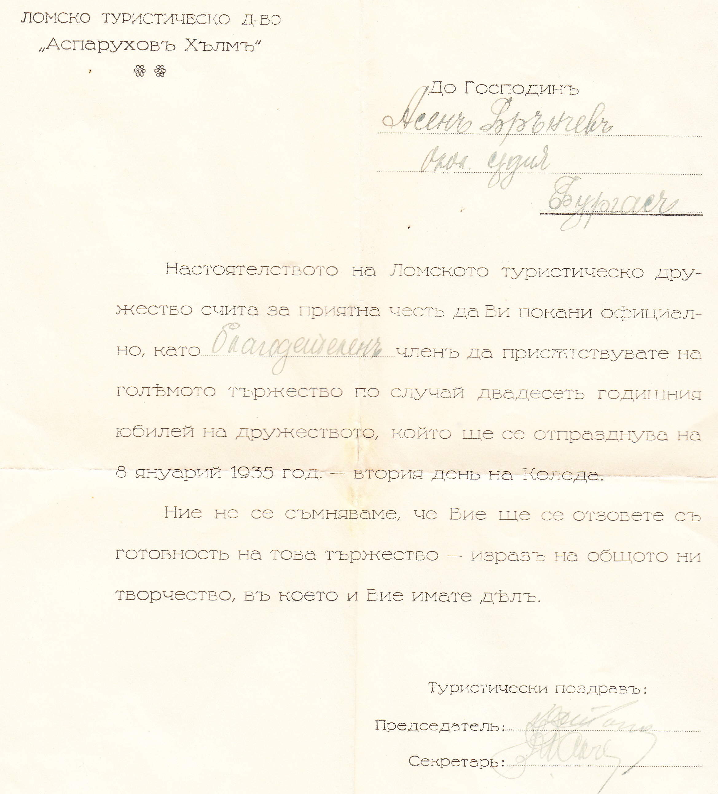 Ломско Туристическо Д-во „АСПАРУХОВ ХЪЛМ“ до господин Асен Брънчев Окол.съдия гр.Бургас. Покана по случай 20- годишнината на дружеството 8.Януари 1935 г.