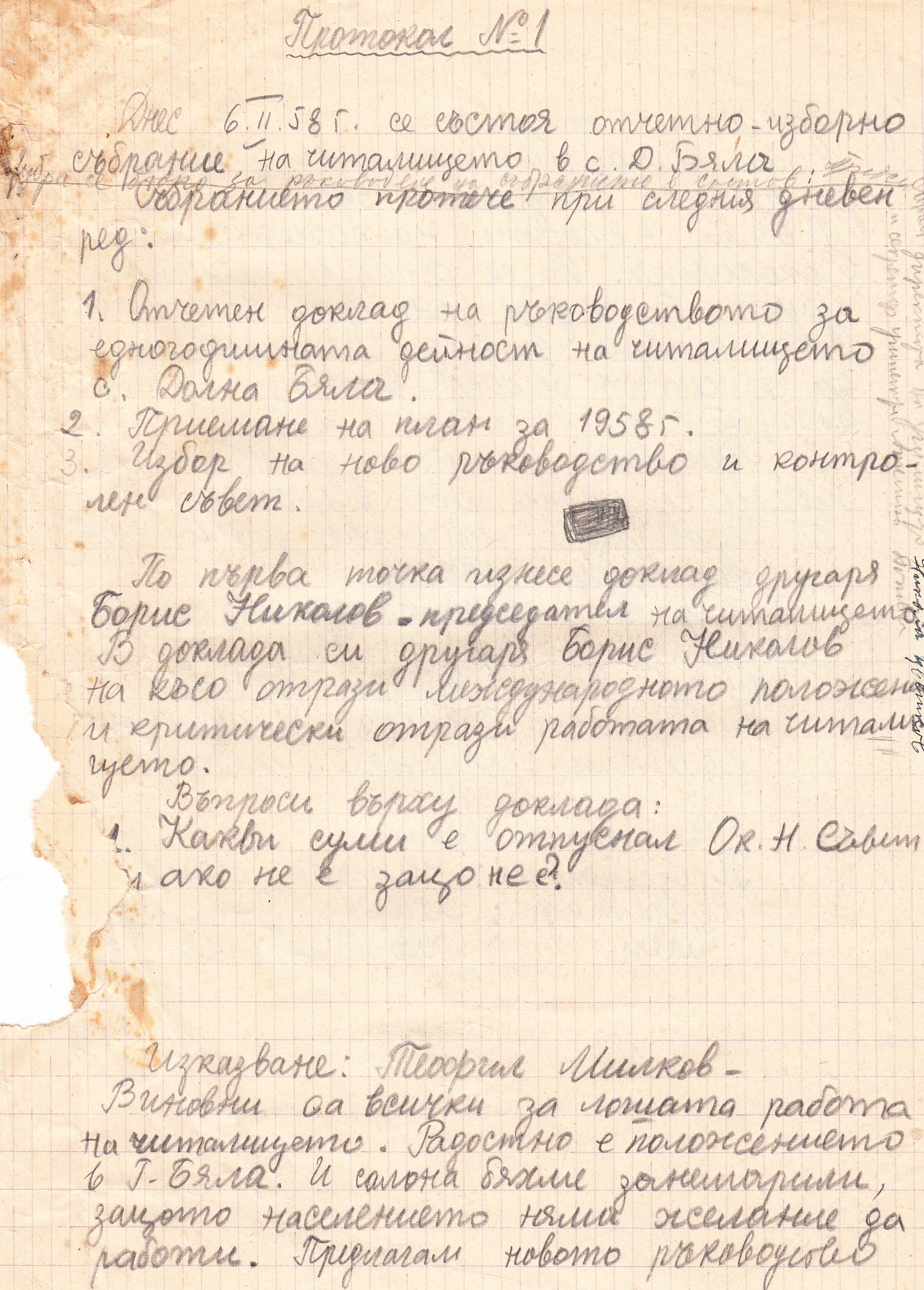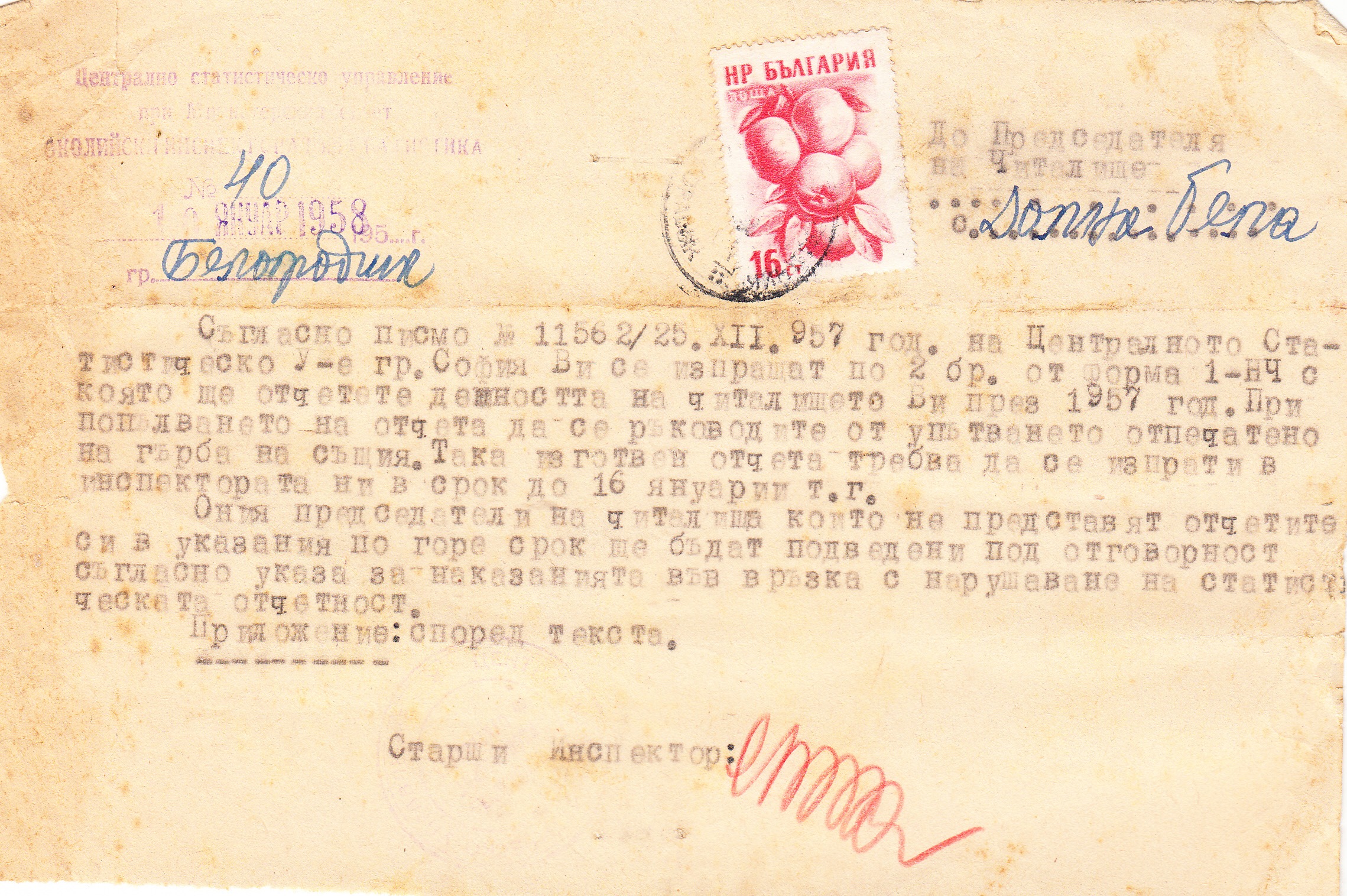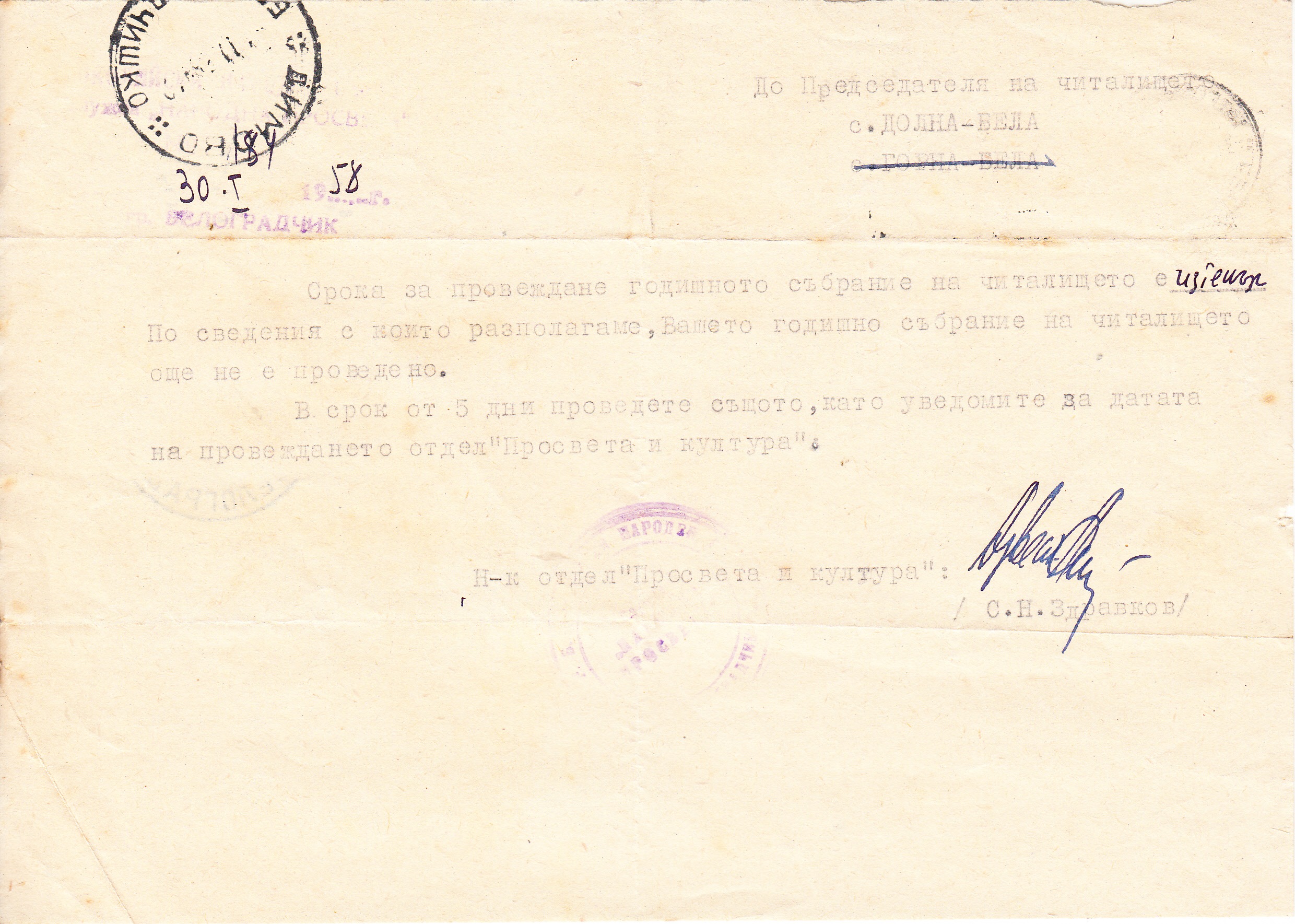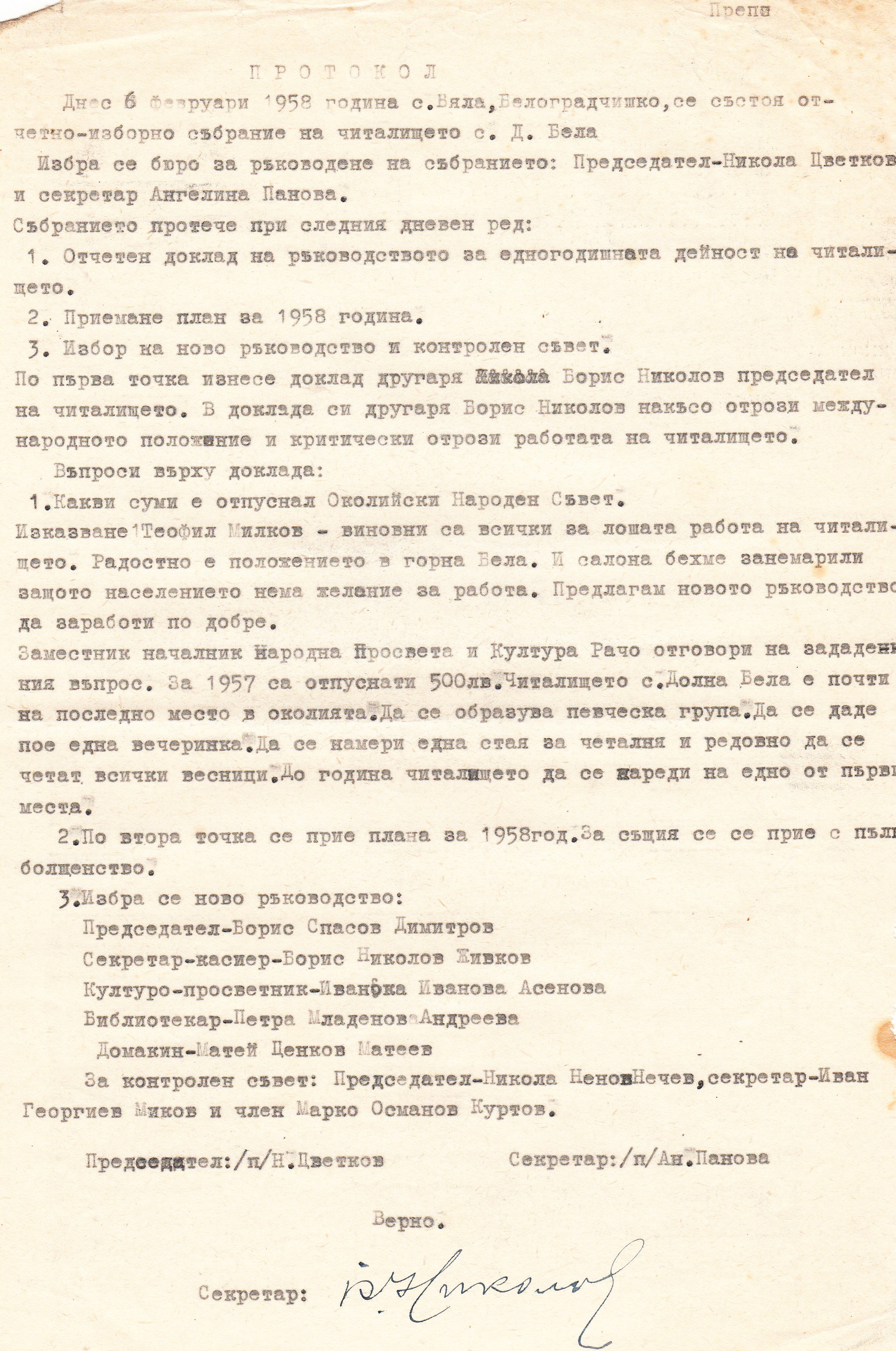 Днес 06.02.1958 година се проведе отчетно изборно събрание на читалището в село Долна Бела.