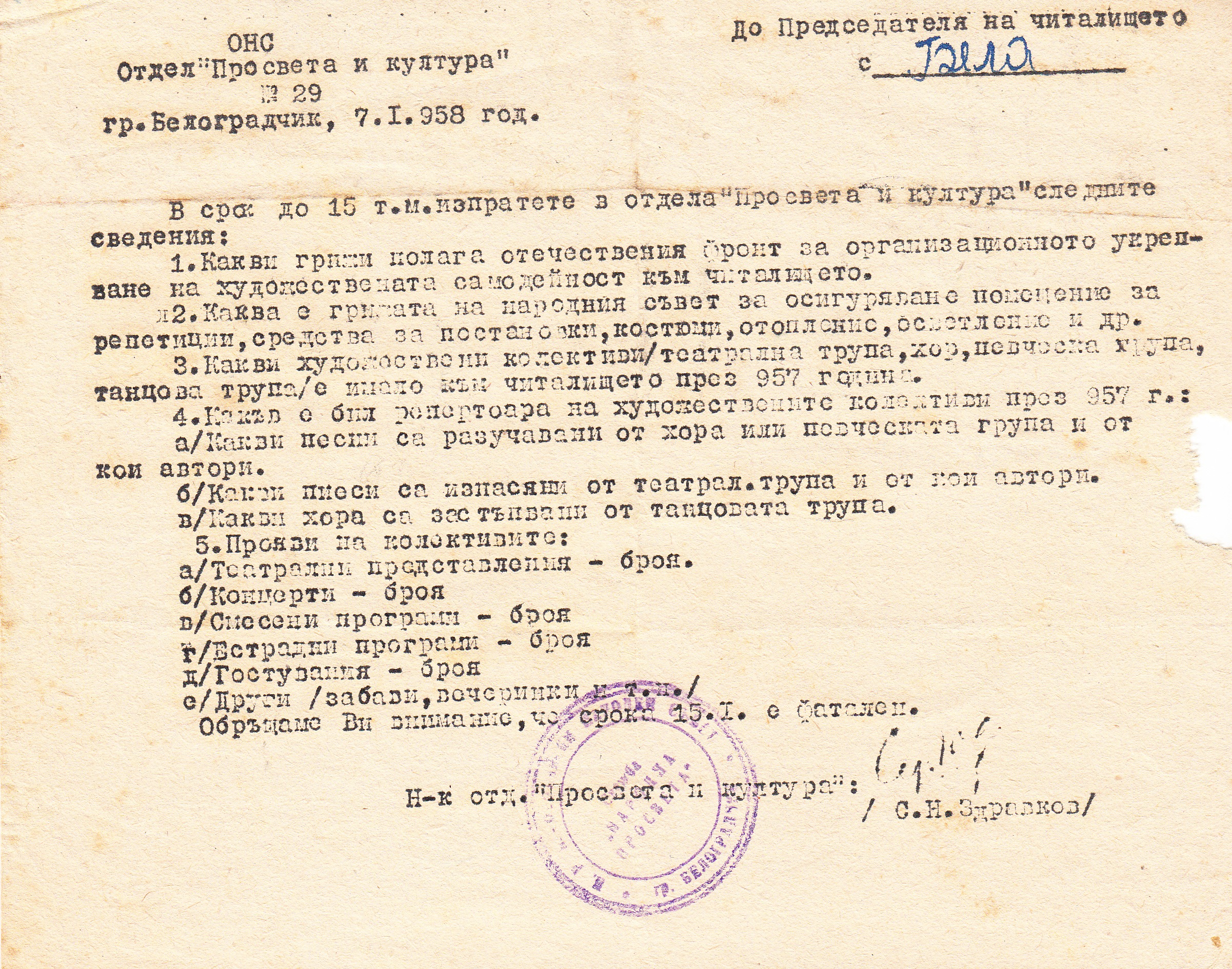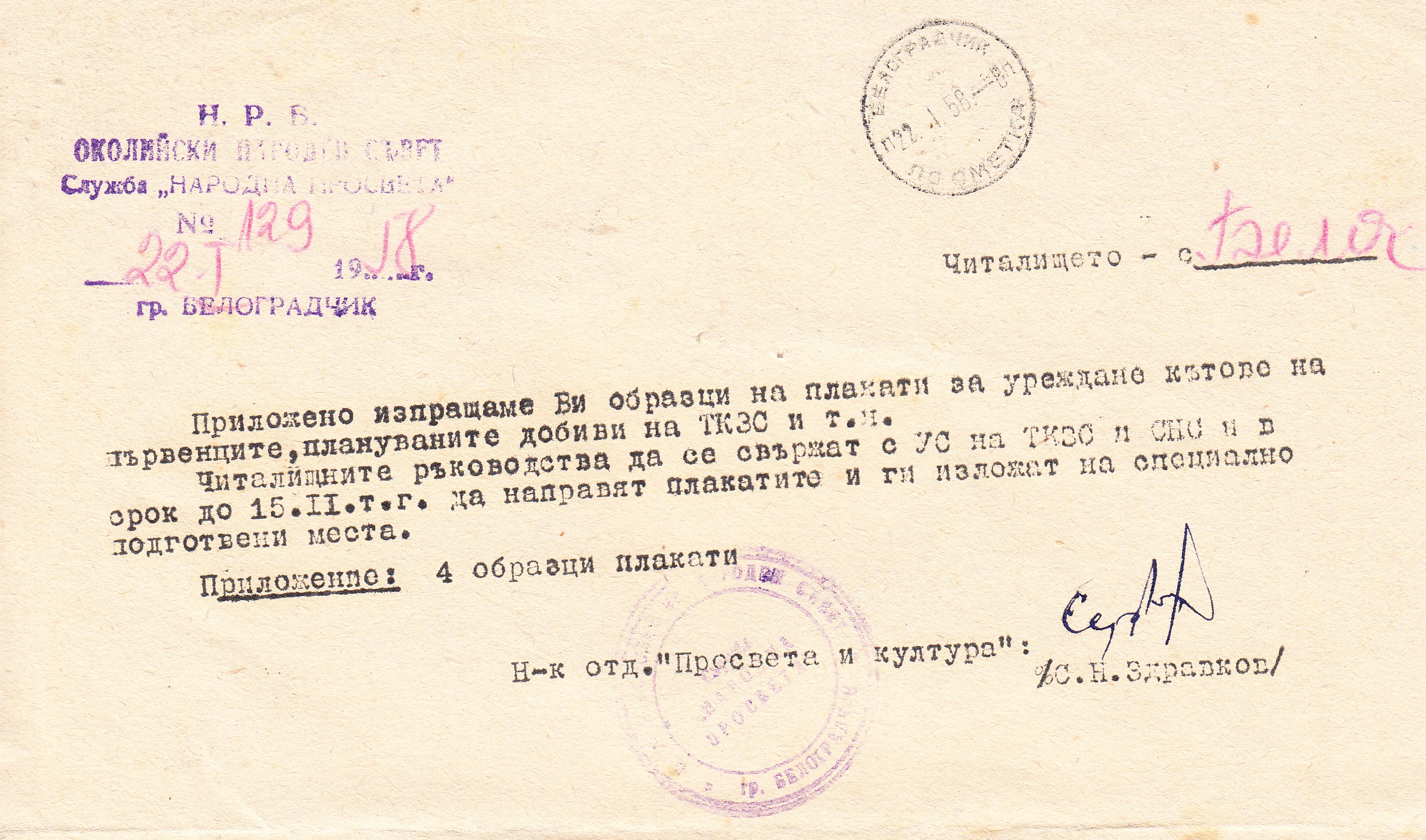 Н-к отдел „Просвета и Култура“ – /П/ С.Н.Здравков