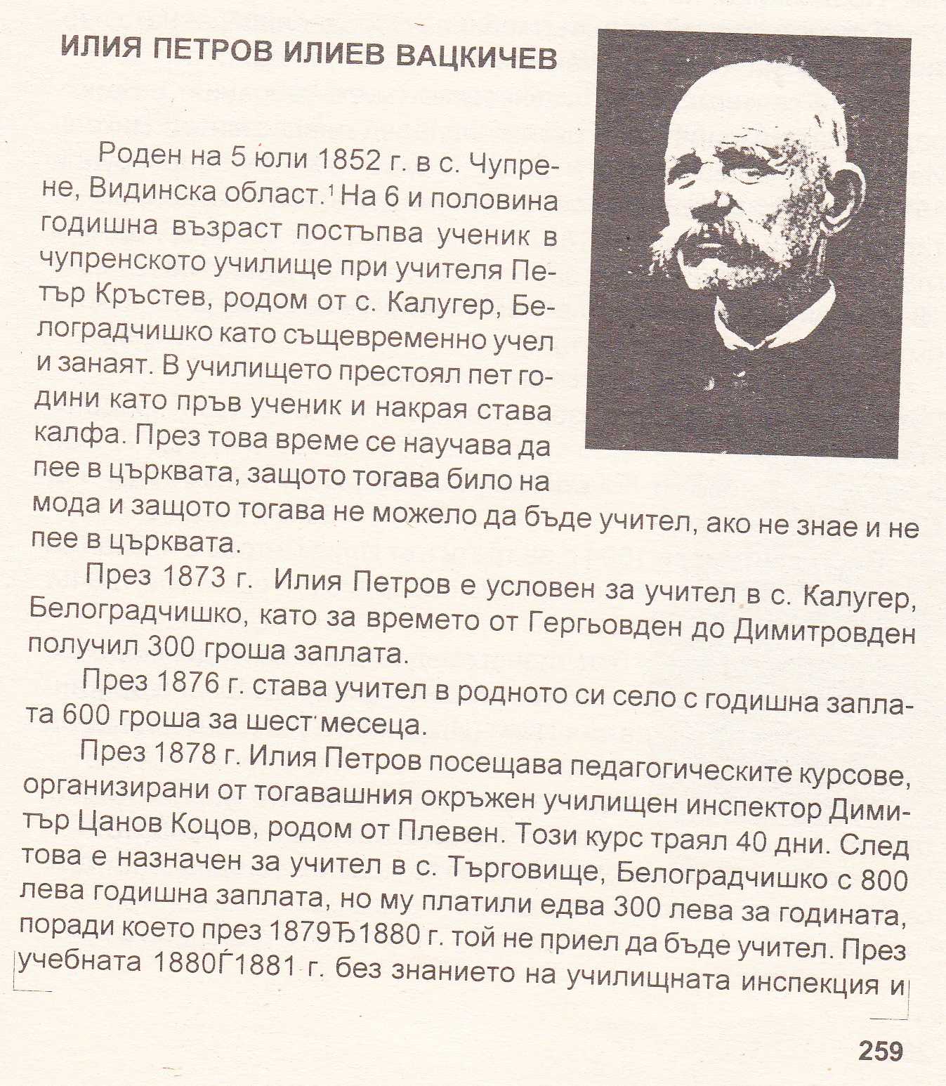 През 1873 година Илия Петров Илиев Вацкичев е условен за учител в село Калугер /Гранитово/, като за времето от Гергьовден до Димитровден е получил 300 гроша заплата.