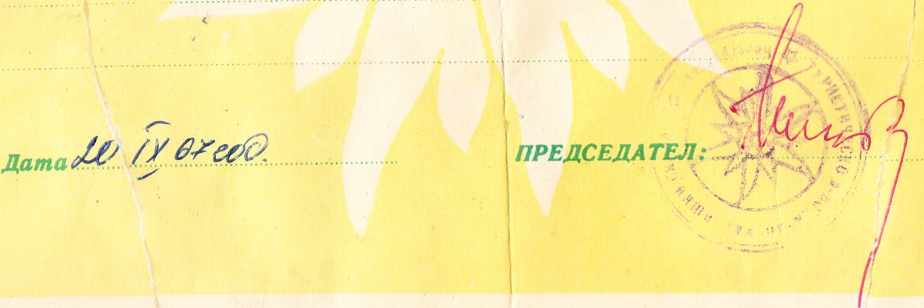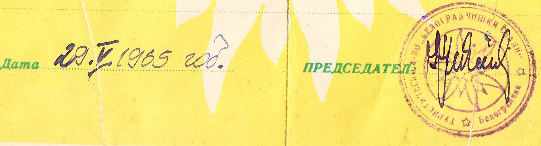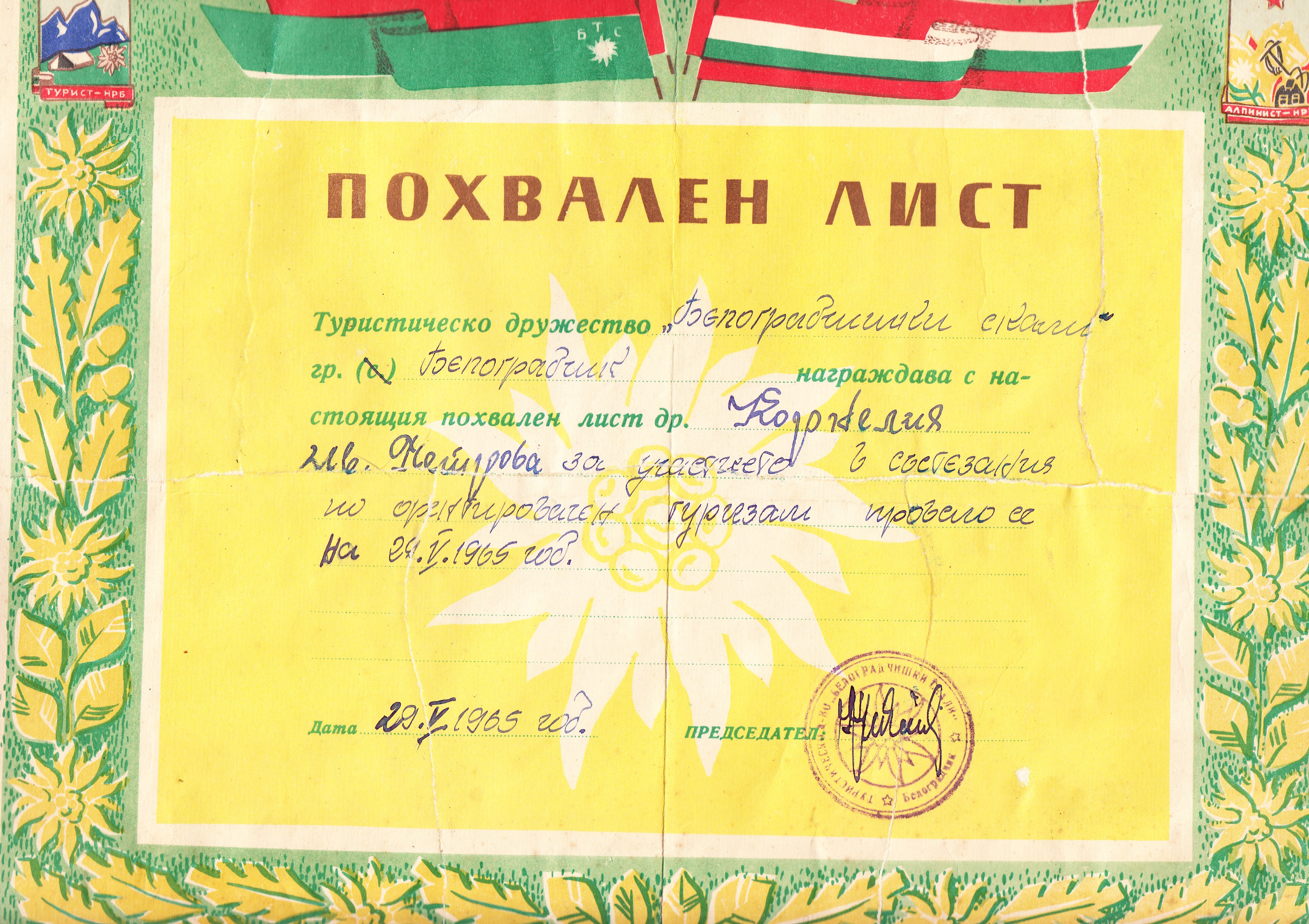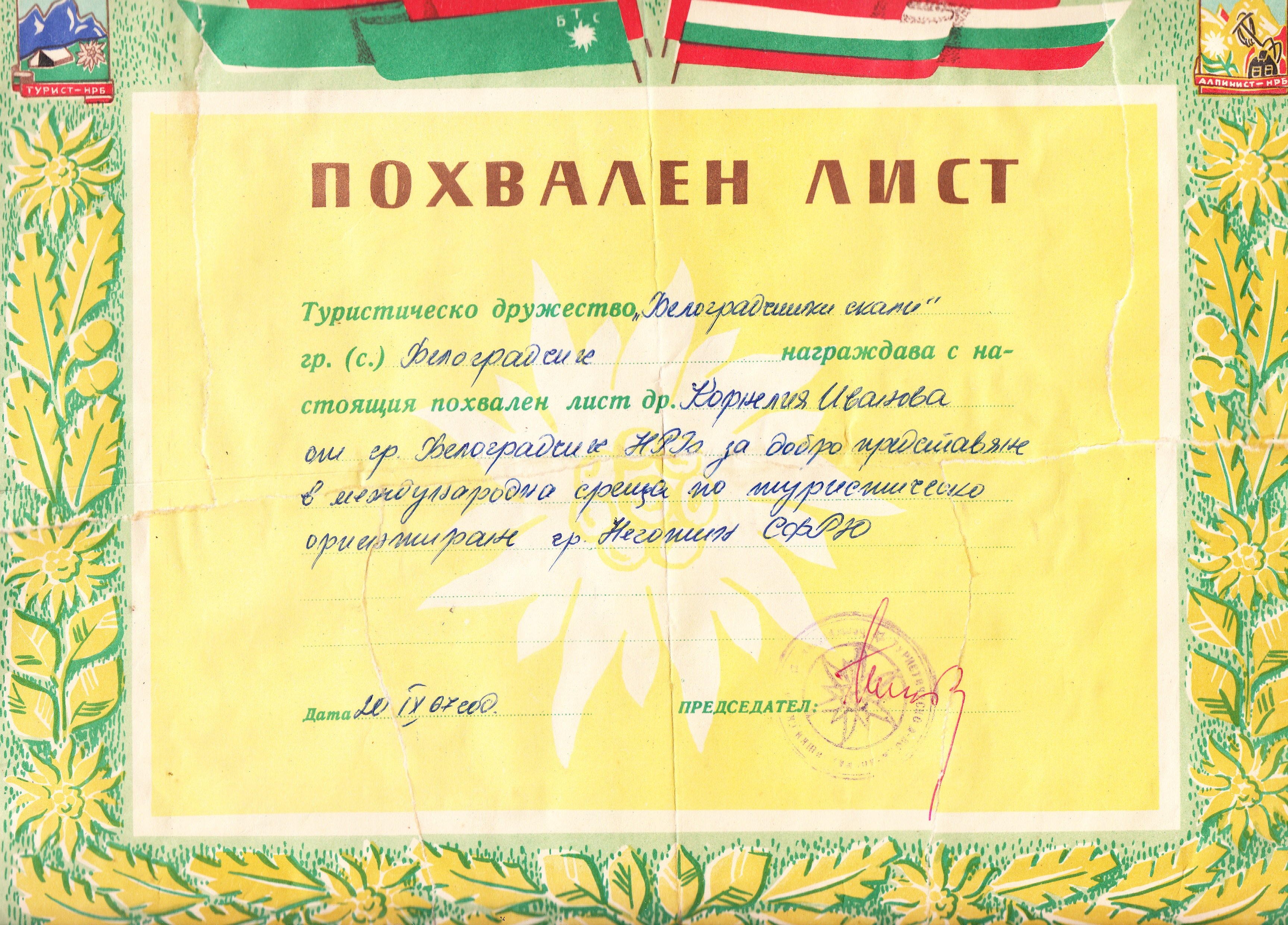 ПОХВАЛЕН ЛИСТ – международна среща в гр.Неготин, СФРЮ /днес Република Сърбия/ – Туристическо ориентиране.