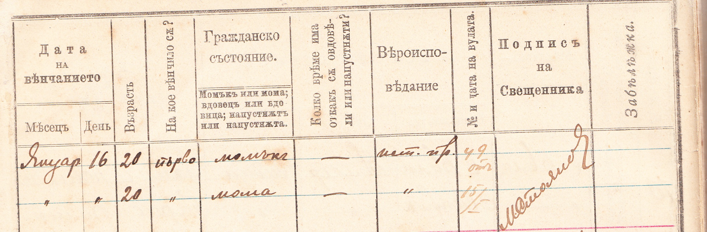 Под N 1 е записано: На 16.01.1905 г. Лукан Атанасов от село Бела на възраст 20 години и Стояна Панова от село Макреш на 20 години. Вула/разрешение да се венчаят/ N 49 от 15 Януари. Свещеник Марко Стоянов.