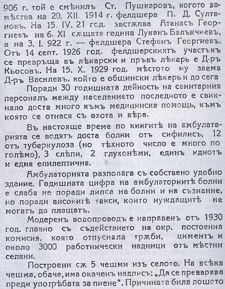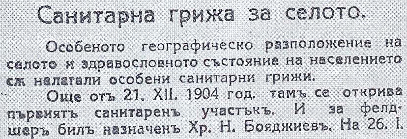 …„ Още от 21.12.1904 година там се открива първия санитарен участък. И за фелдшер е бил назначен Хр.Н.Бояджиев. На 26.01.1906 год. той е сменил Ст. Пушкаров, когото замества на 20.12.1914 год. фелдшера П.Д.Султанов . На 15.04.1921 год. Атанас Георгиев , на 06.11. 1921 год. Лукан Балакчиев“…..