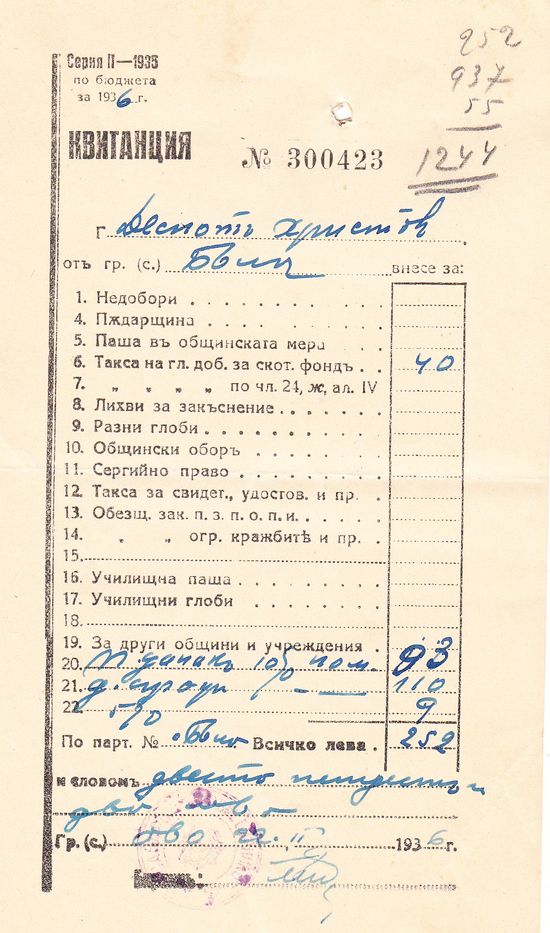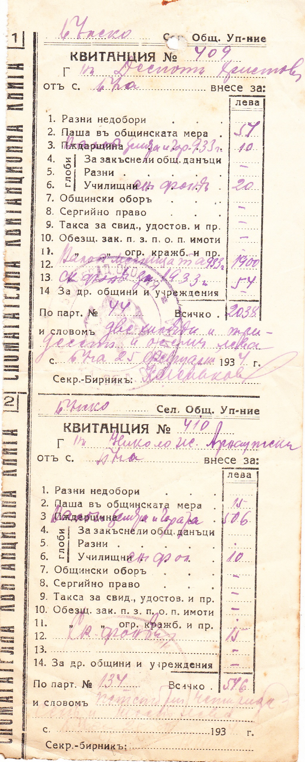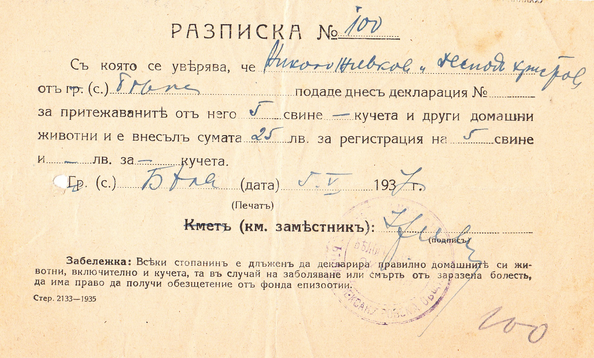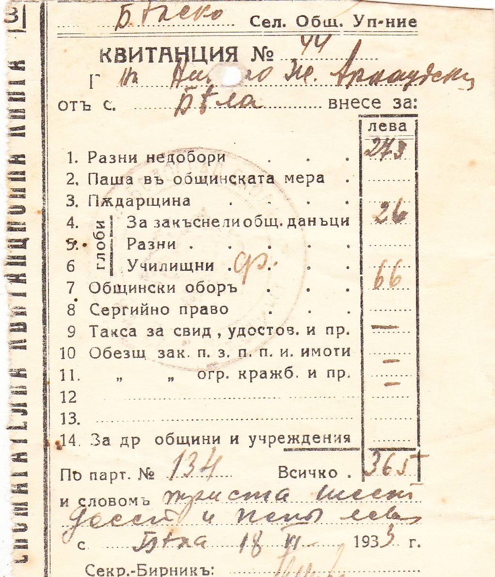 Разписка-Заместник кмет с.Бела 1937 г. : Никола Иванов