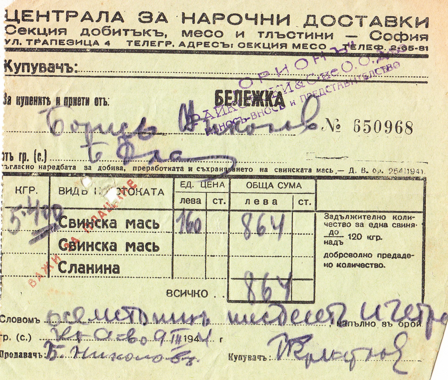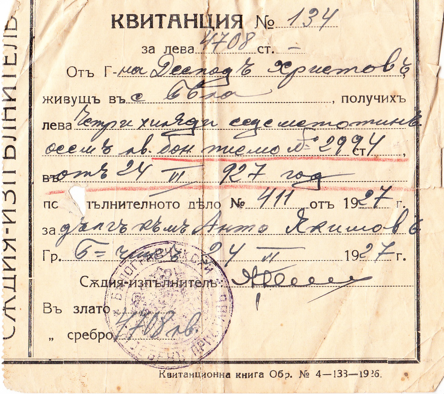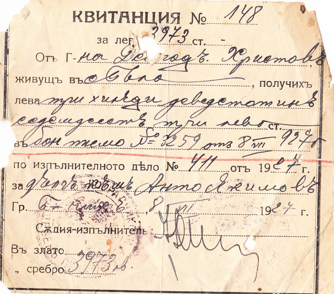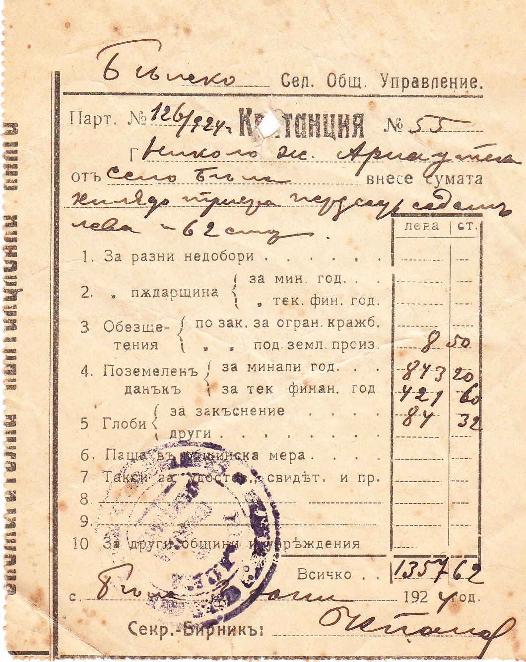 Разписка-Заместник кмет с.Бела 1937 г. : Никола Иванов
