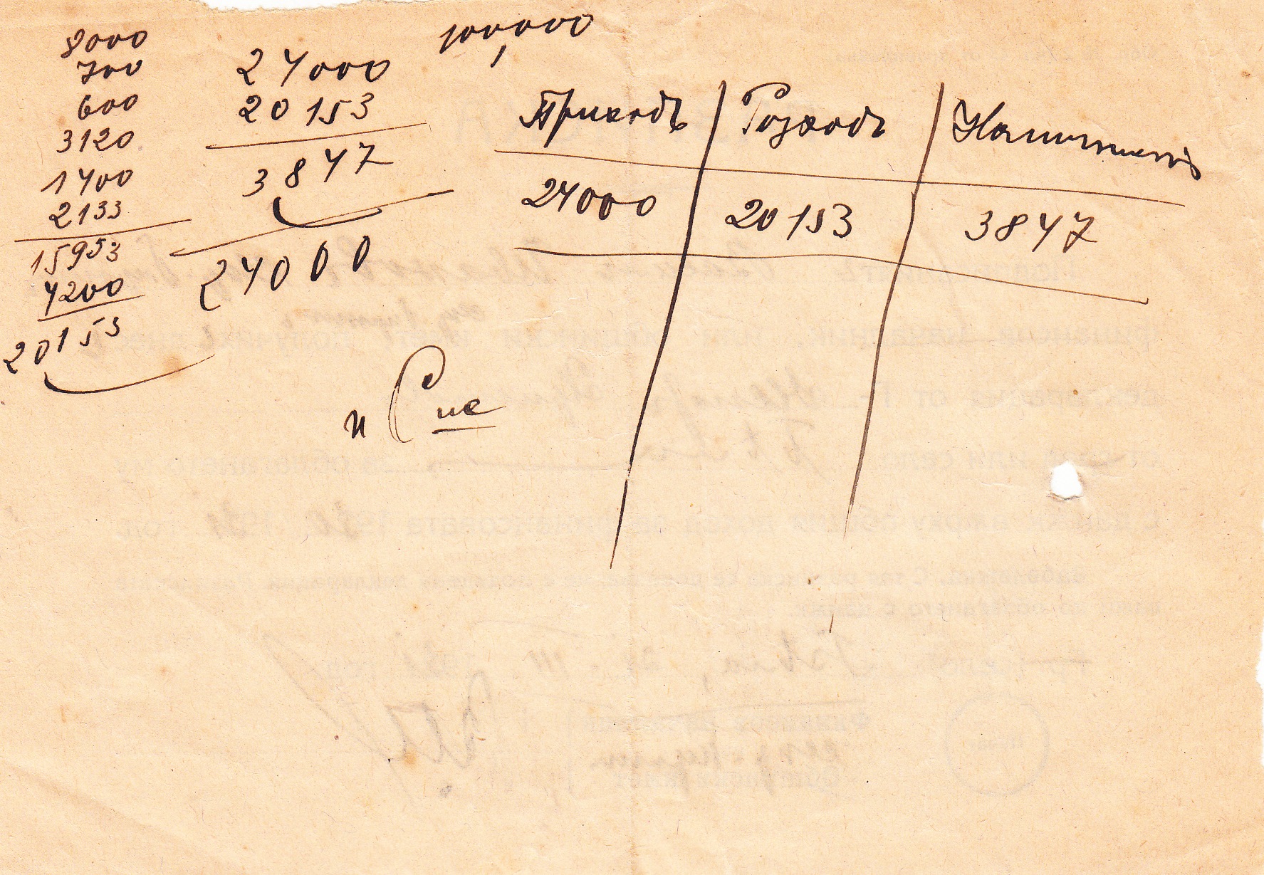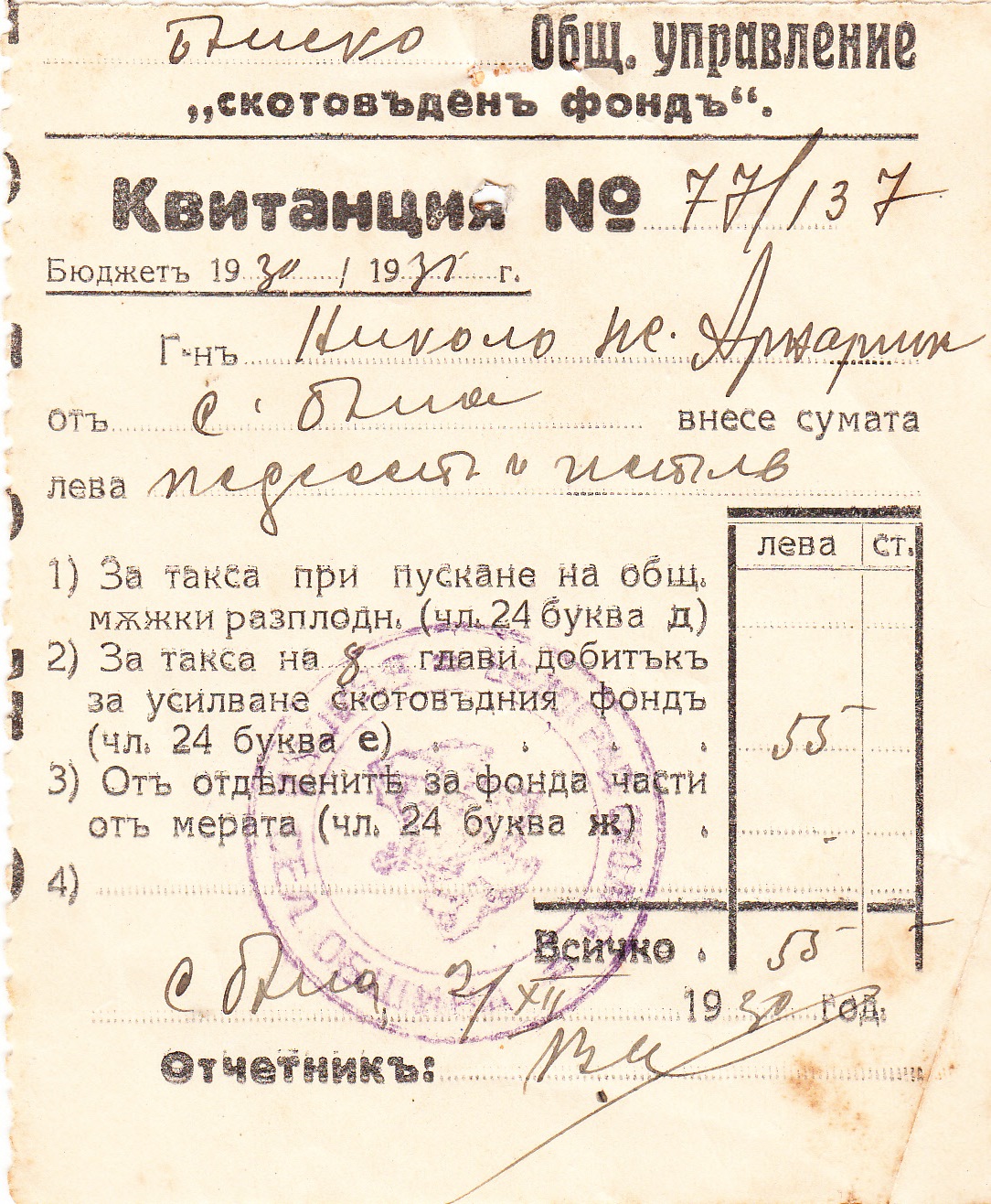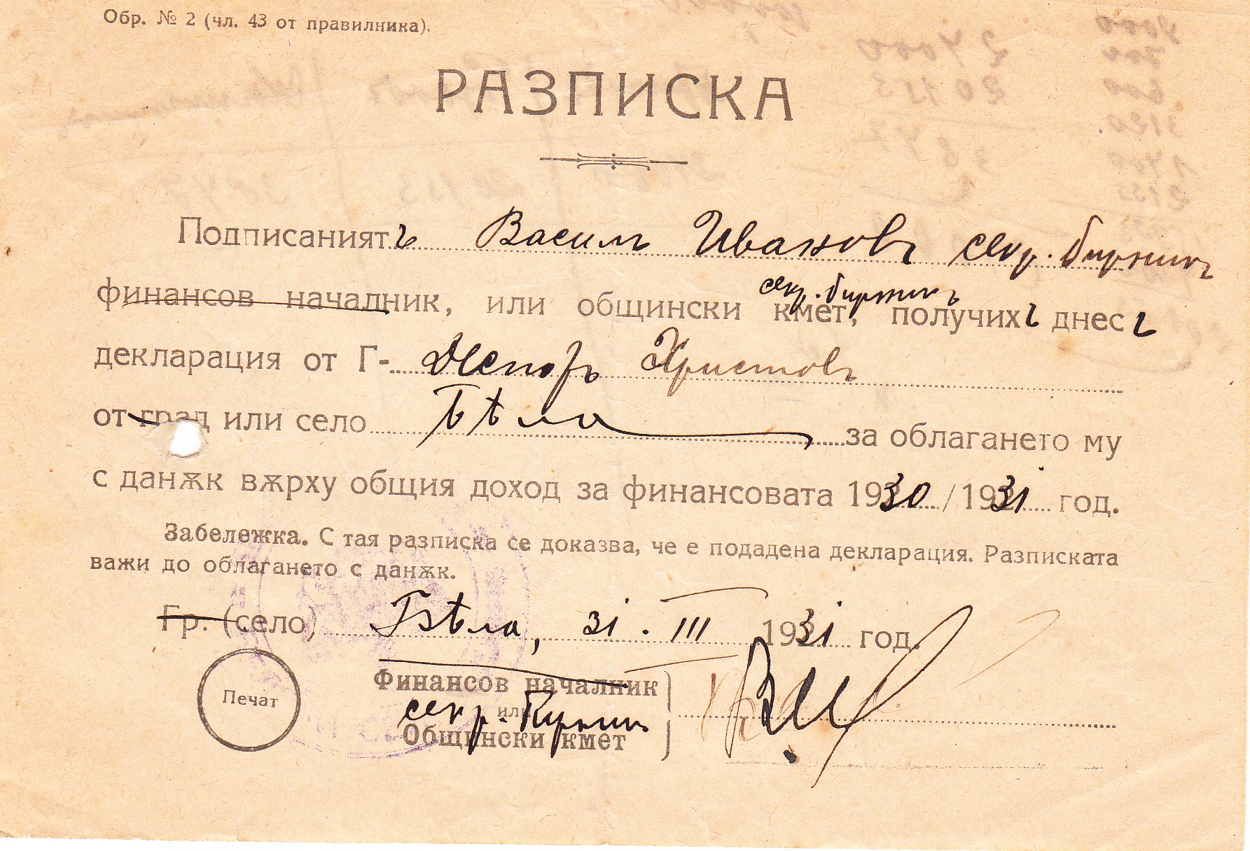 Разписка Васил Иванов-секр.бирник 1931 г. Общ доход за 1930/31 г.
