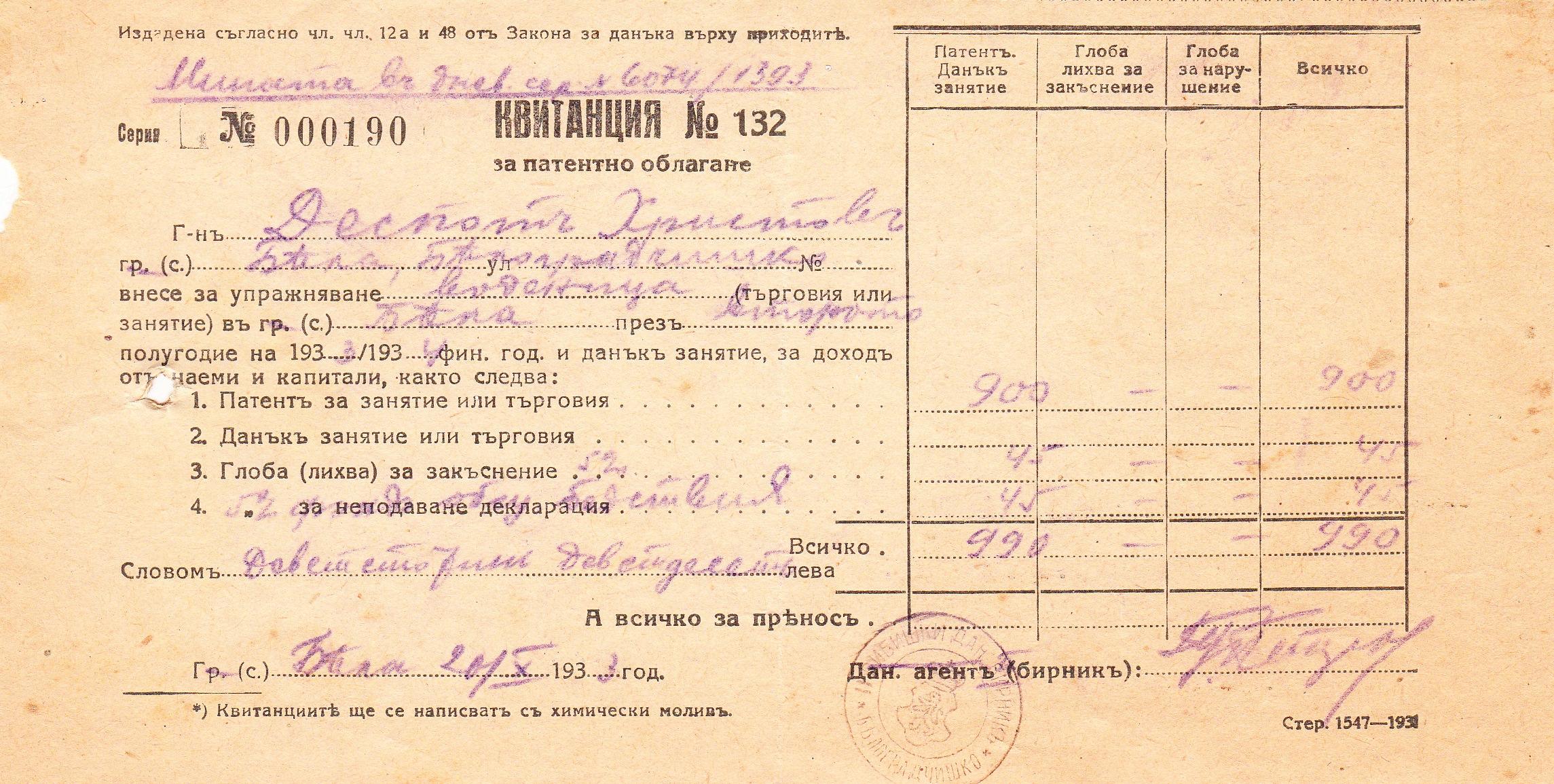 Няколко документа за валцовата мелница на Деспот Христов с. Бела. 30-те години.