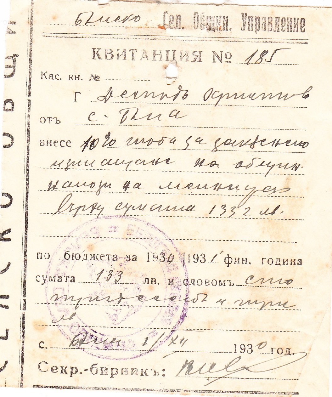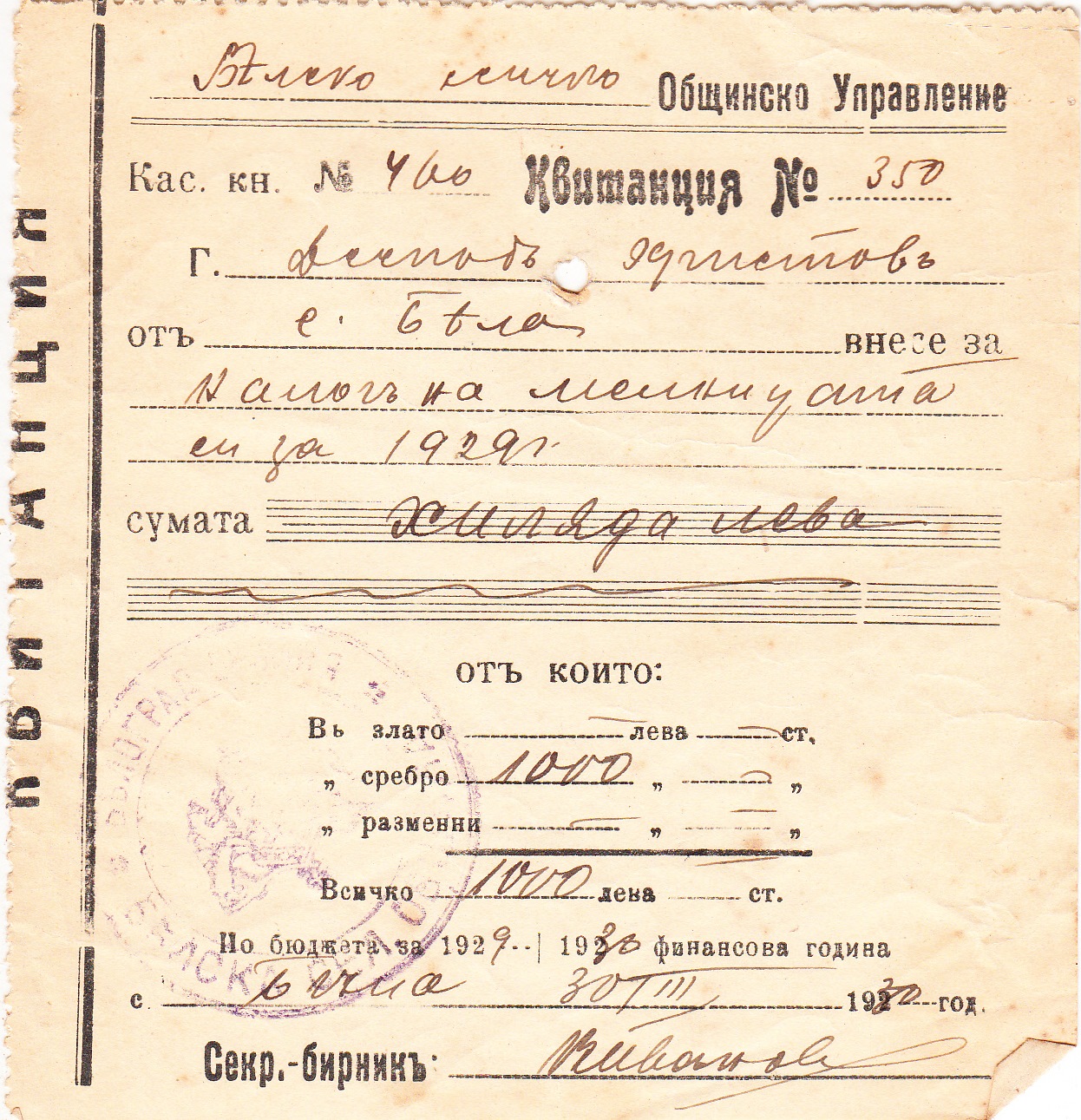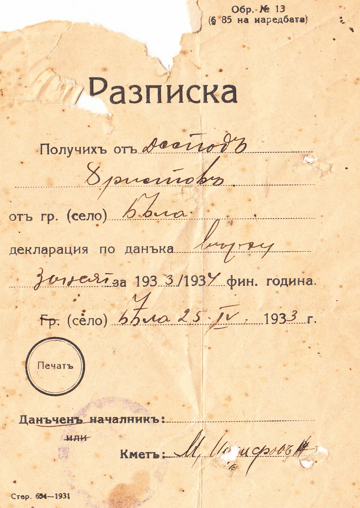 Разписка 1933 г. Кмет с.Бела : Мико Йосифов, Налог на месница с един валц и един обикновен камък 1930 година – секр.бирник: Васил Иванов