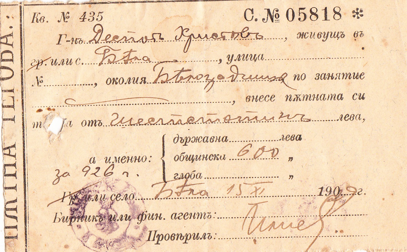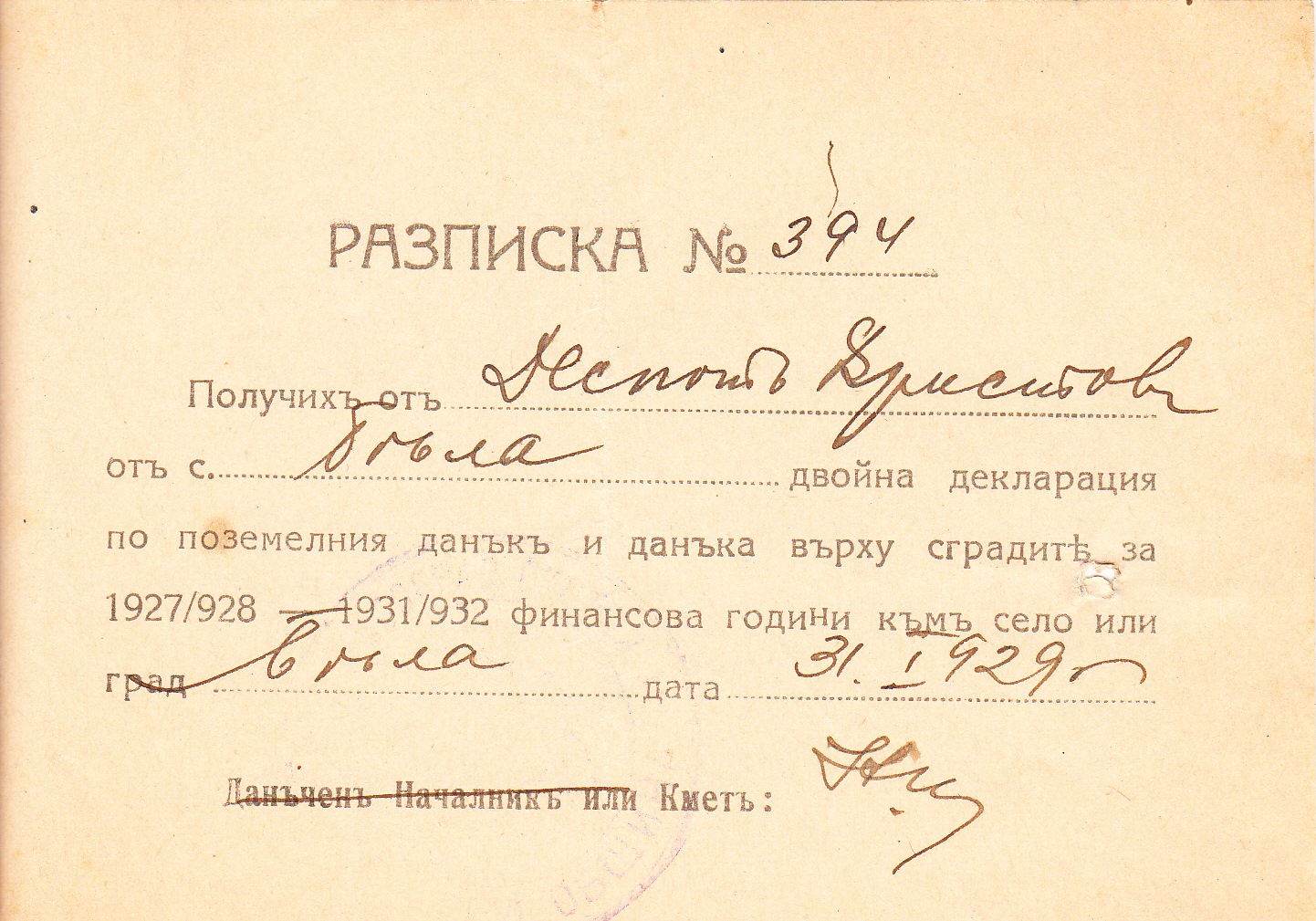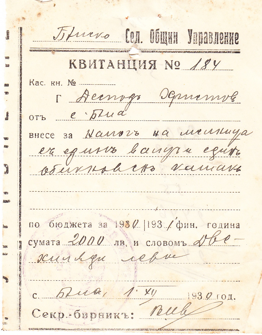Разписка 1933 г. Кмет с.Бела : Мико Йосифов, Налог на месница с един валц и един обикновен камък 1930 година – секр.бирник: Васил Иванов