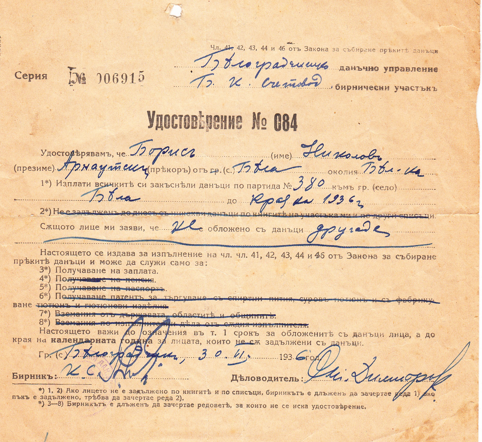 1936 г. Белоградчишко данъчно управление – Бирник: /П/, Деловодител:/П/ Ст.Димитров