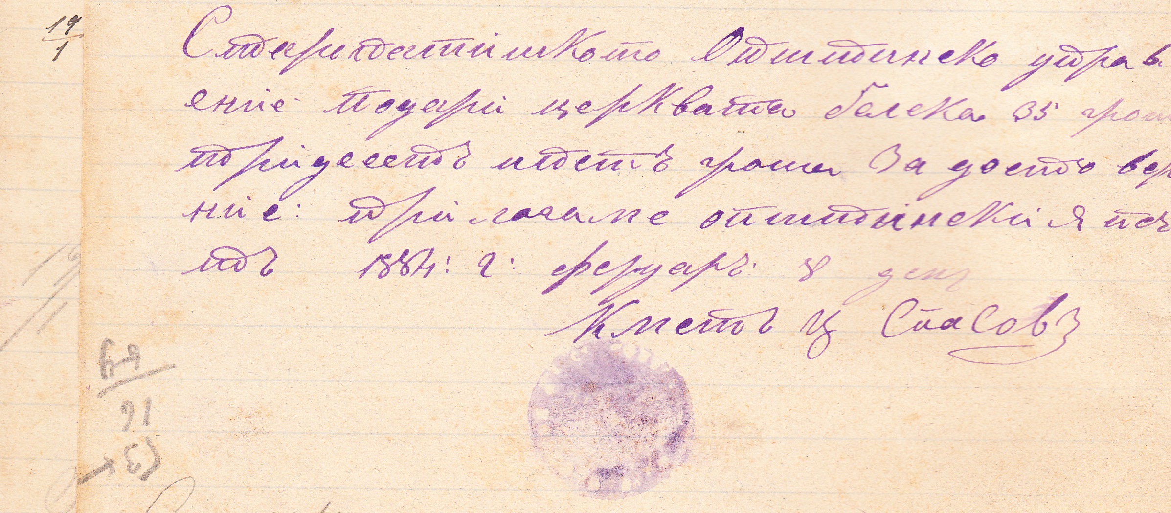 ,,Старопатишкото общинско управление подари на църквата Белска 33 гроша /тридесет и три гроша/. За удостоверение прилагаме общинския печат: 1884 год. Февруари 8 ми.