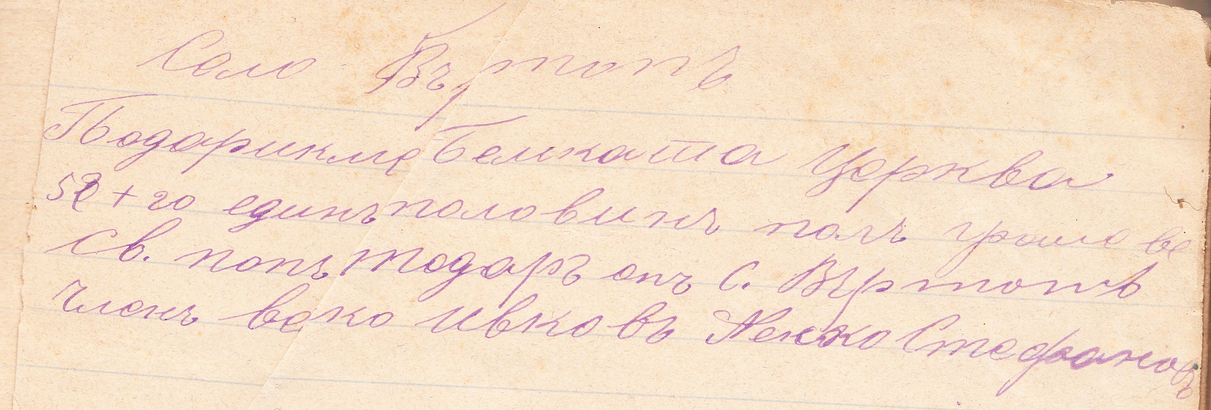 През 1884 година Белската община предприема кампания за събиране на дарения за довършване строежа на църквата в село Бела. В този документ е представено дарението от село Въртоп.
