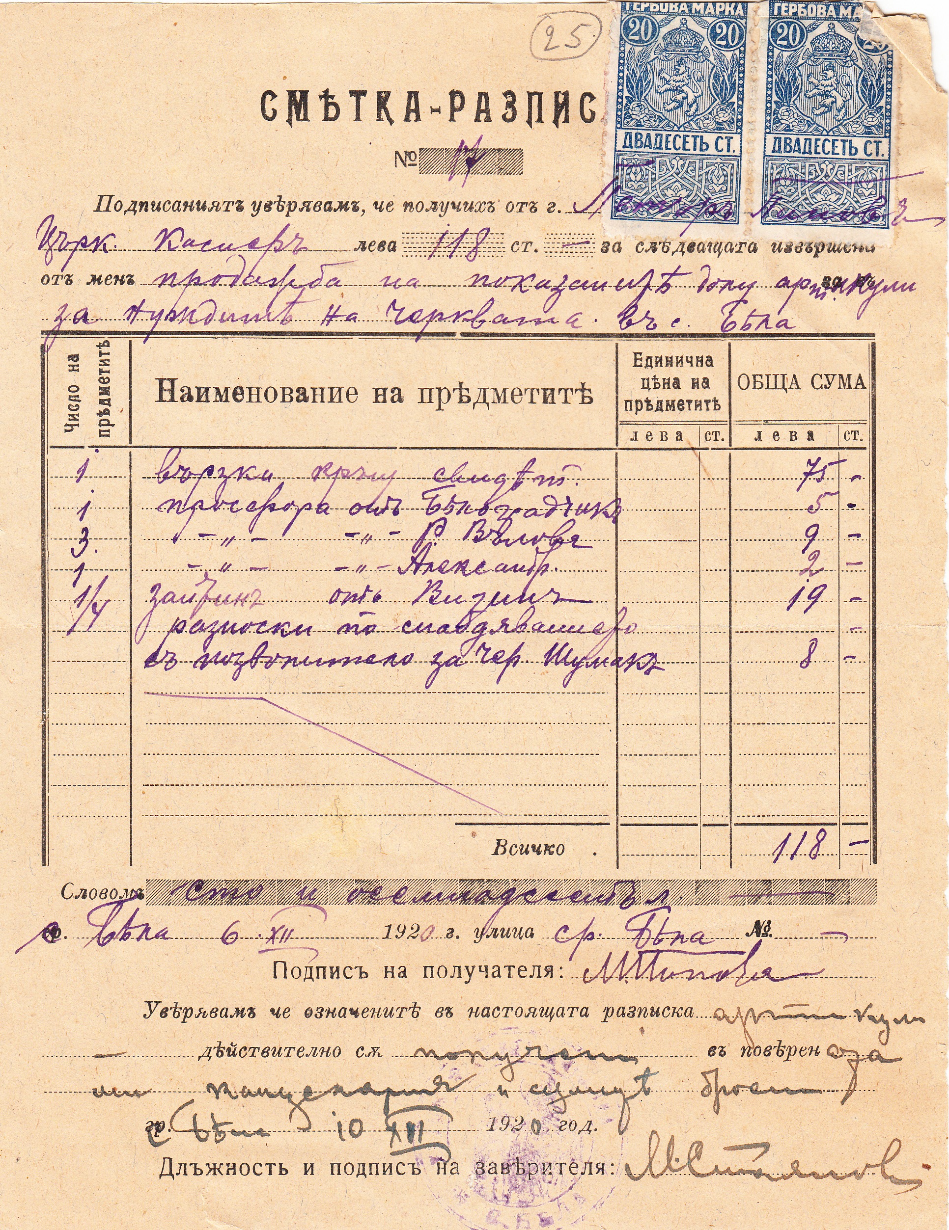 Една сметко-разписка на Белската църква от 10.12.1920 година.