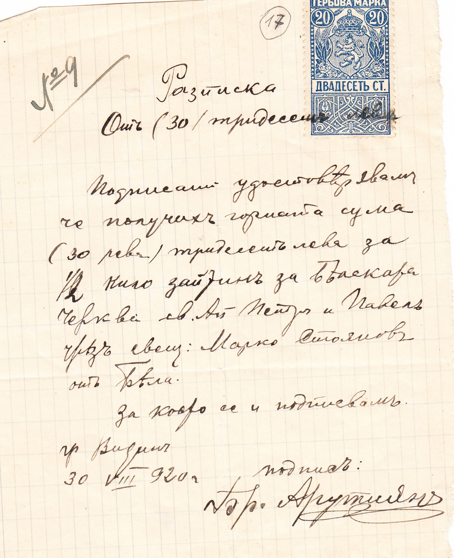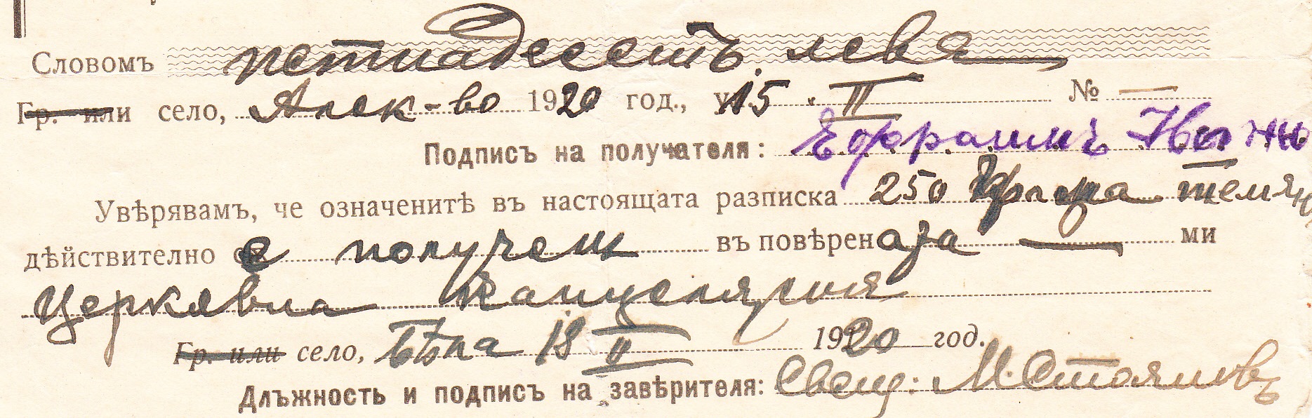 Една сметко-разписка от 15.02.1920 година на Белската църква.