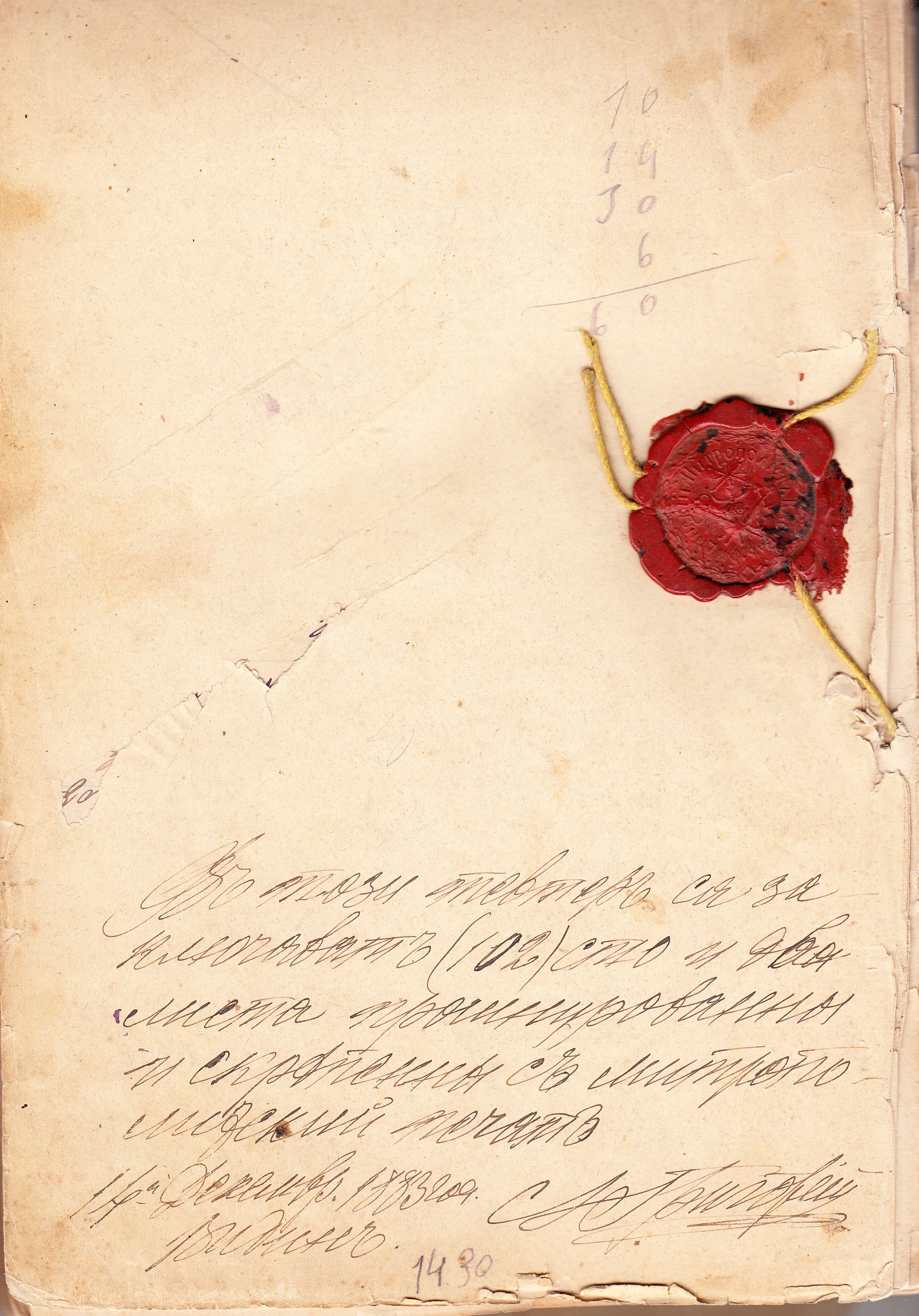 …„ В този тефтер се заключават /102/ сто и два листа прошноровани и скрепени с митрополитский печат…“