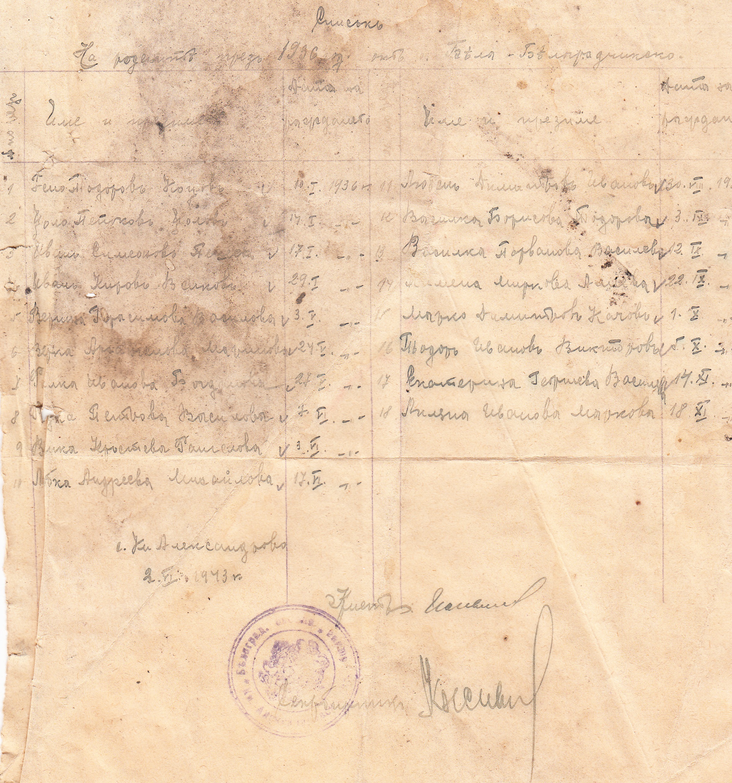 Списъ от 2 Април 1943 година на децата родени 1936 година в село Бела.