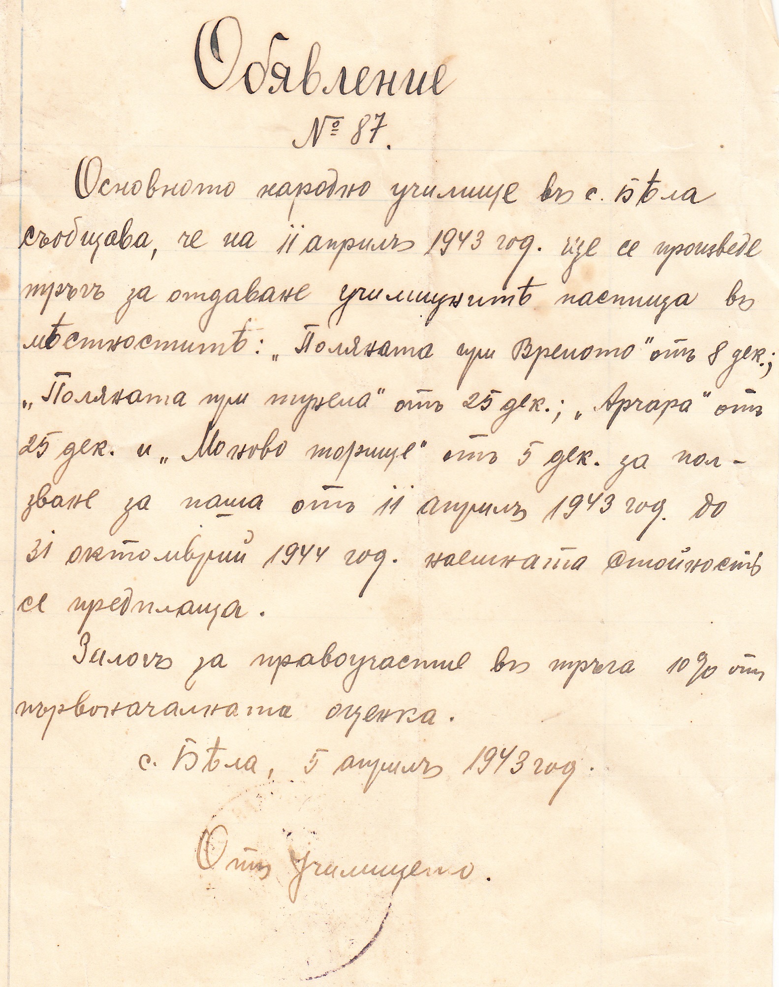 …Основното народно училище в село Бела съобщава, че на 11 Април 1943 год. ще се възпроизведе търг за отдаване училищните пасища в местността: